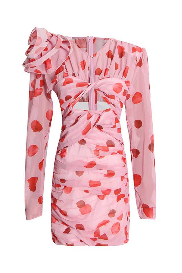 3D floral. pleated. cut-out. mini dress. long sleeve. pink
