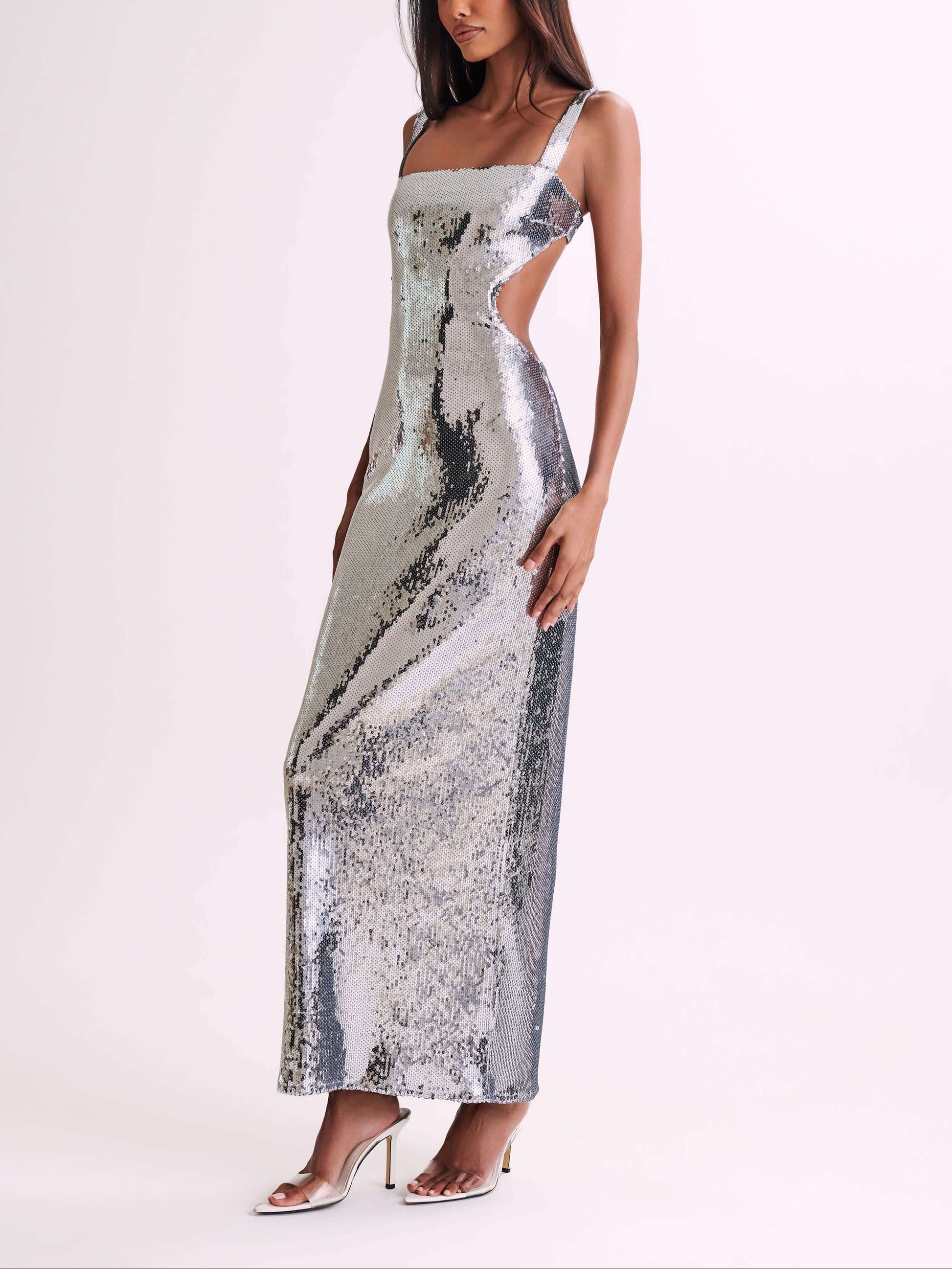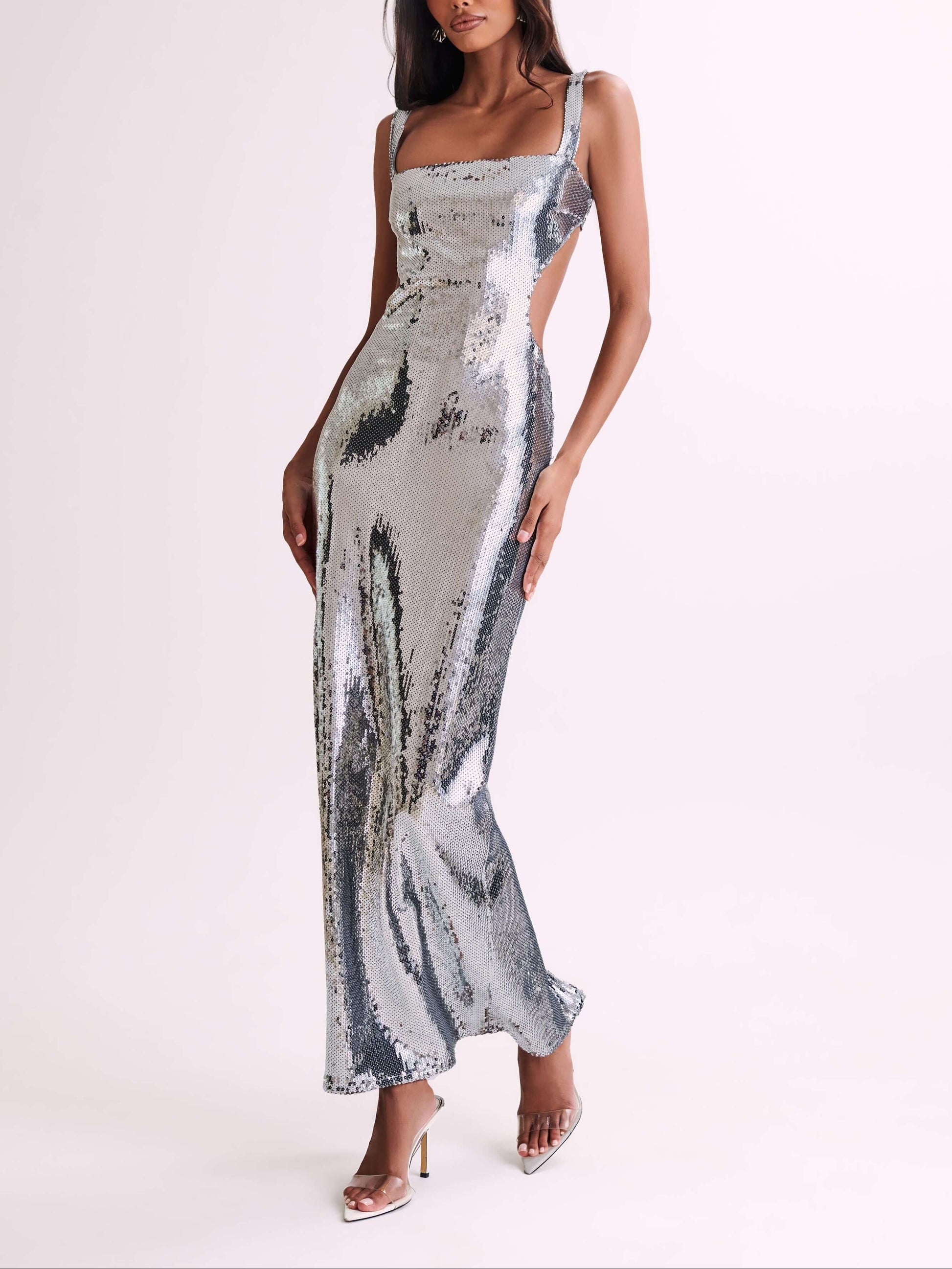 This sequined dress has a square neckline and strategic cutouts. The straps blend into a bra-type closure at the upper back.