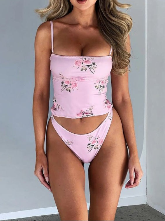 This two-piece bikini features a camisole top with soft pink roses and green foliage print on a blush background.
