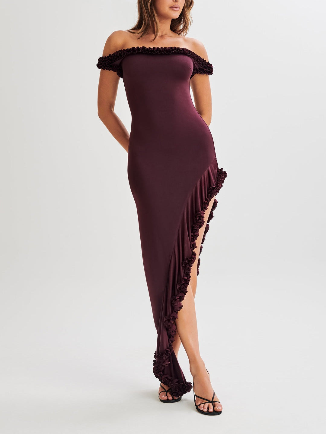 This dress features an off-the-shoulder design and asymmetrical hem exuding contemporary sophistication.