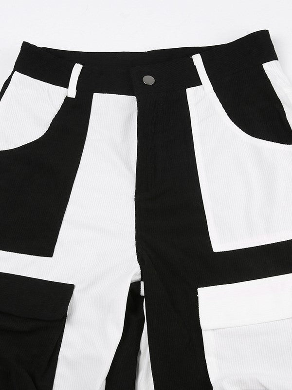 Description: Cargo pants are a must-have for 90s wardrobes. being trendy and versatile to style. These cargo pants are made from soft corduroy fabric. durable. and comfortable to wear. Cut in a flattering silhouette. they feature a contrast color-block panel style. functional cargo pockets on the leg. and finish with a button-fly design.