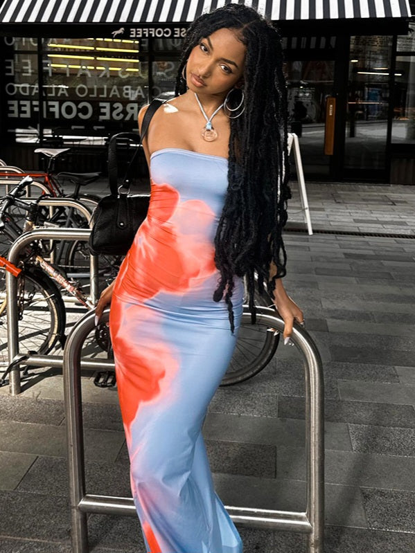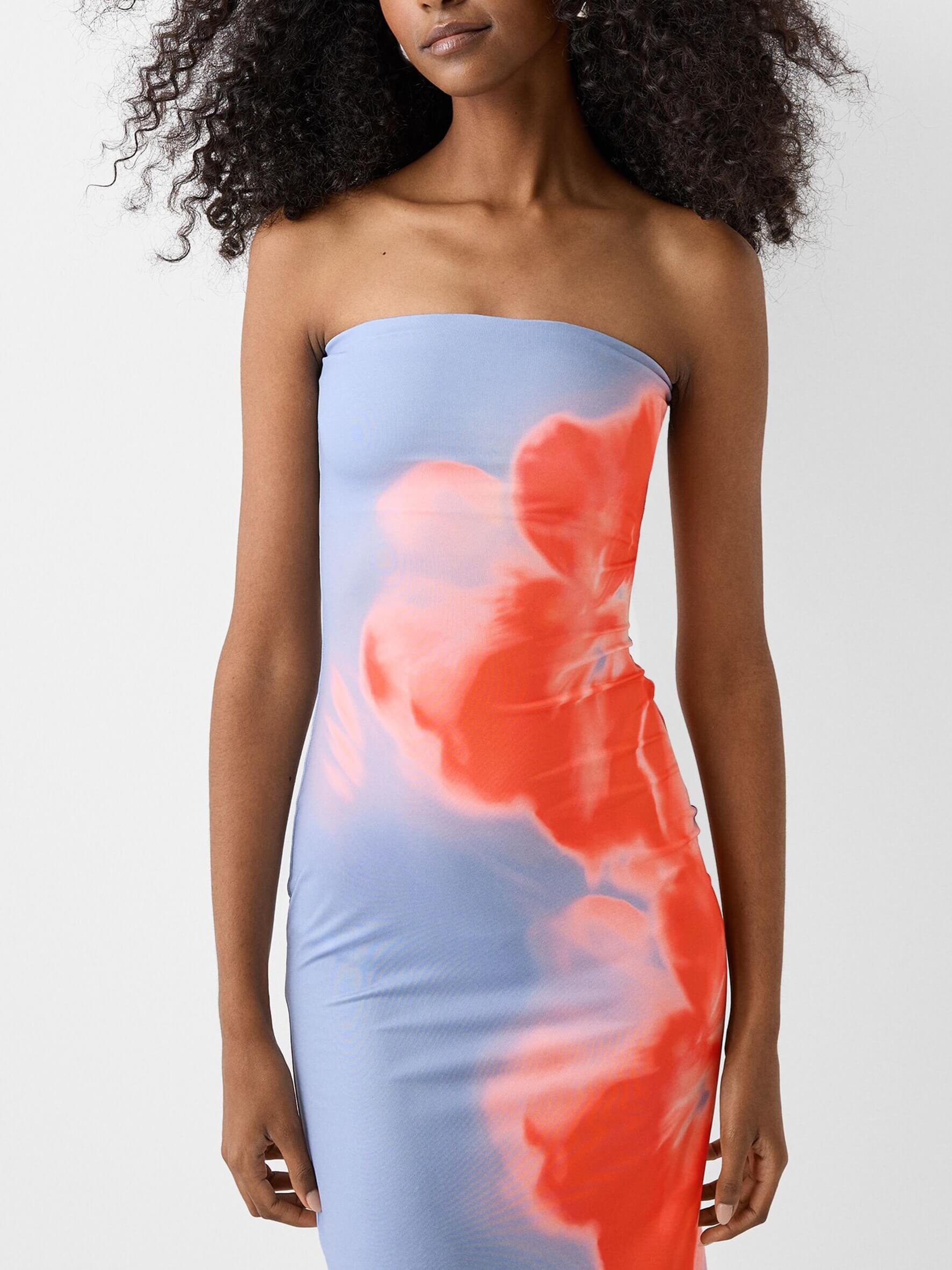 This dress features a soft blue serene canvas for the vibrant coral and orange floral accents that adorn one side.
