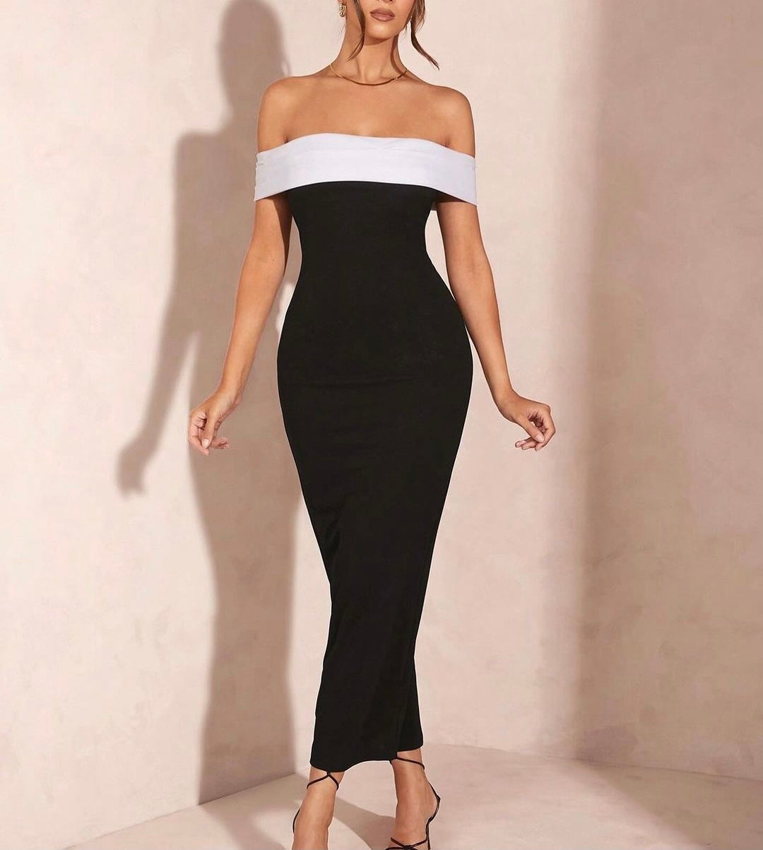 The off-shoulder neckline is white contrasting beautifully with the black dress. It tapers at the knees. flaring slightly at the hem.