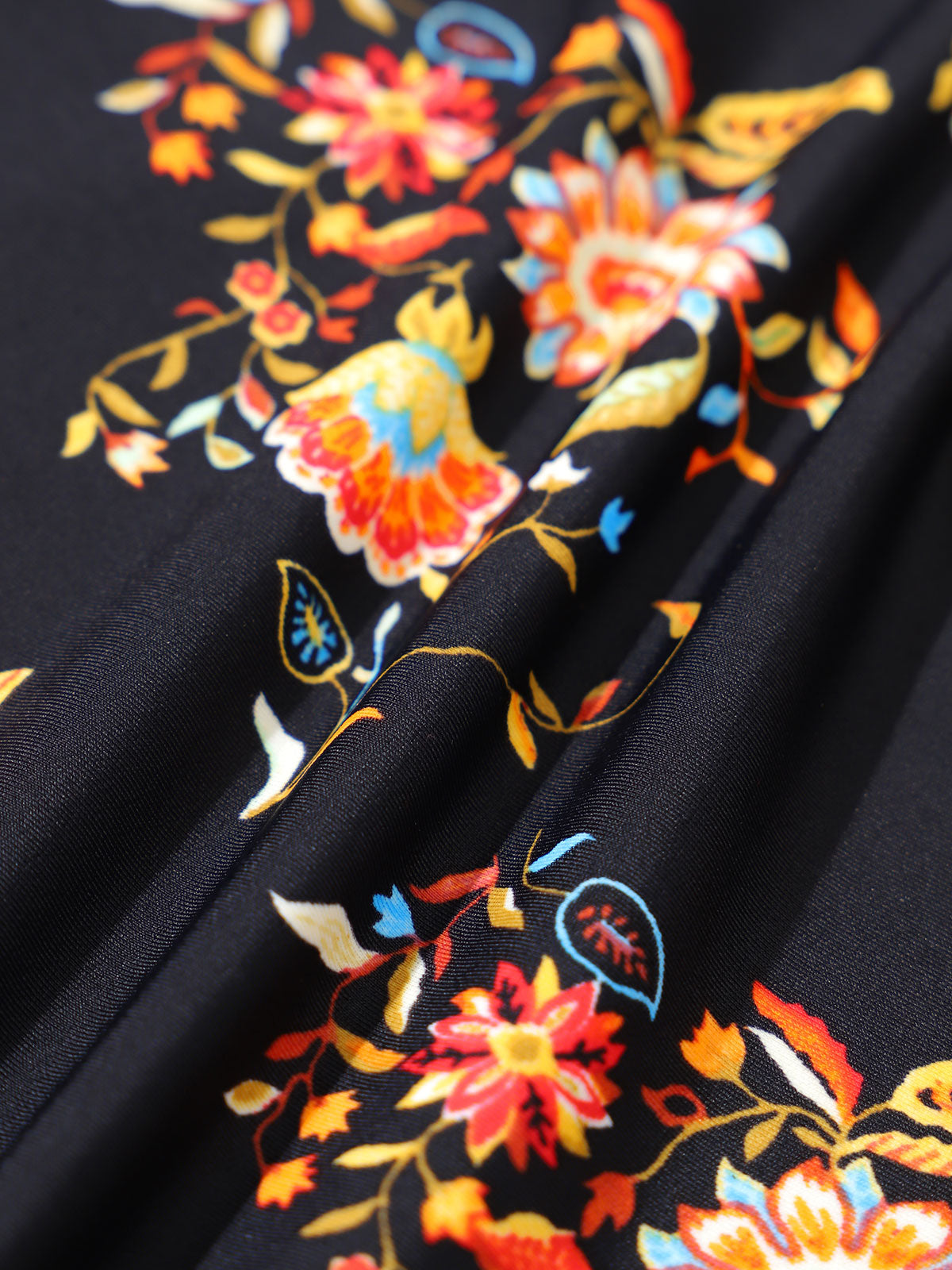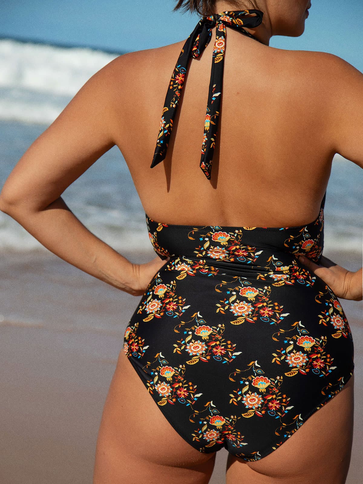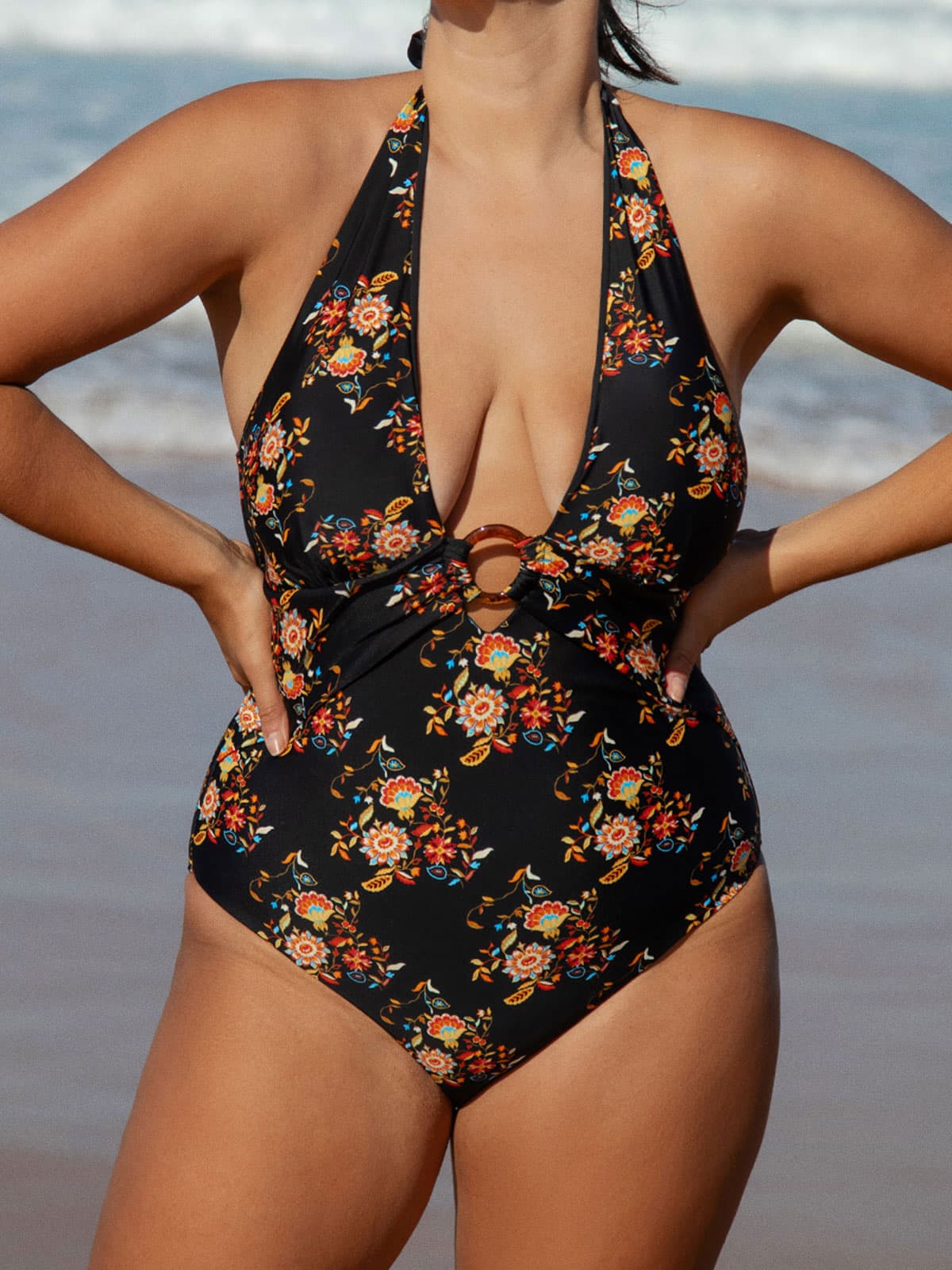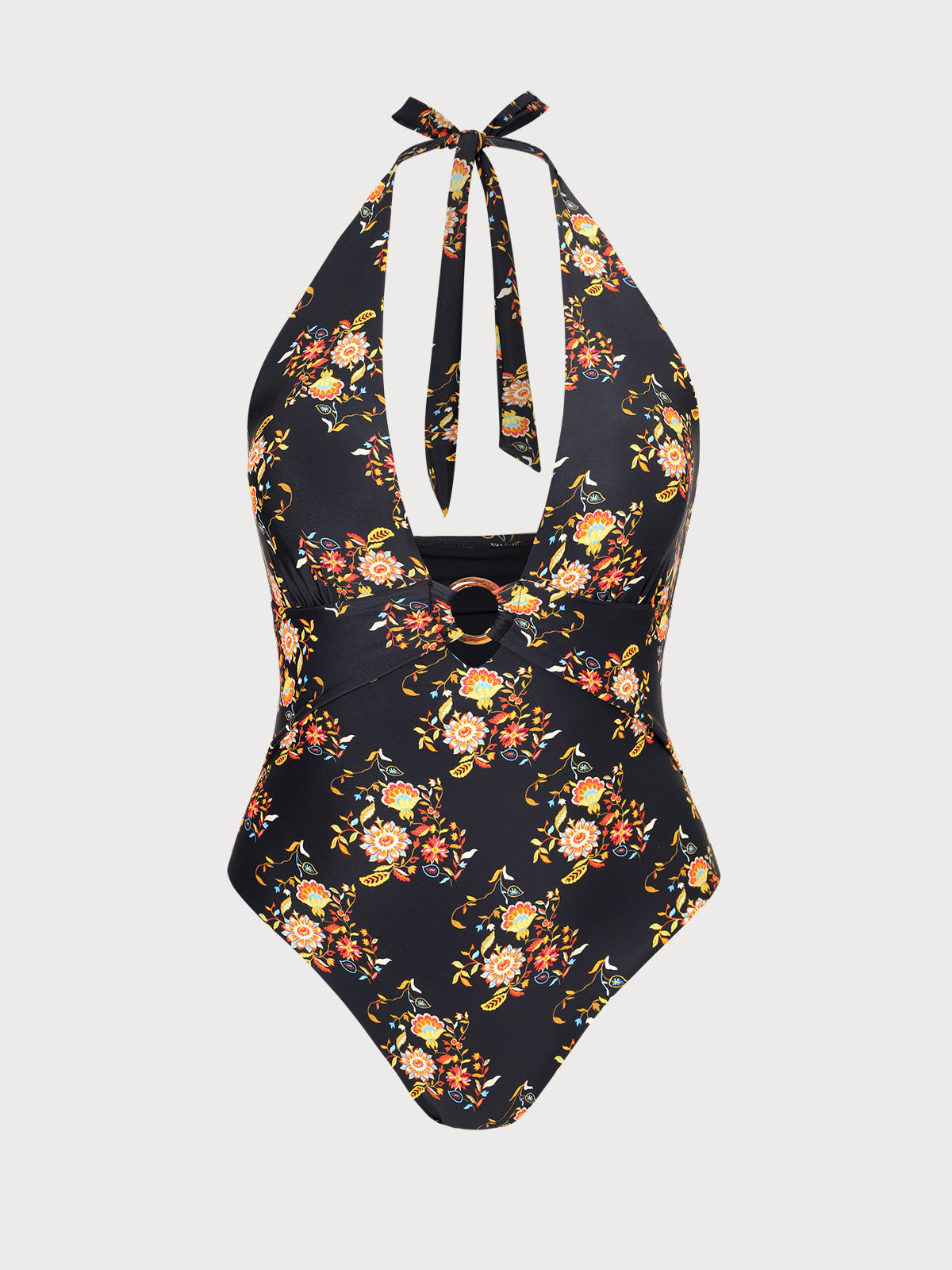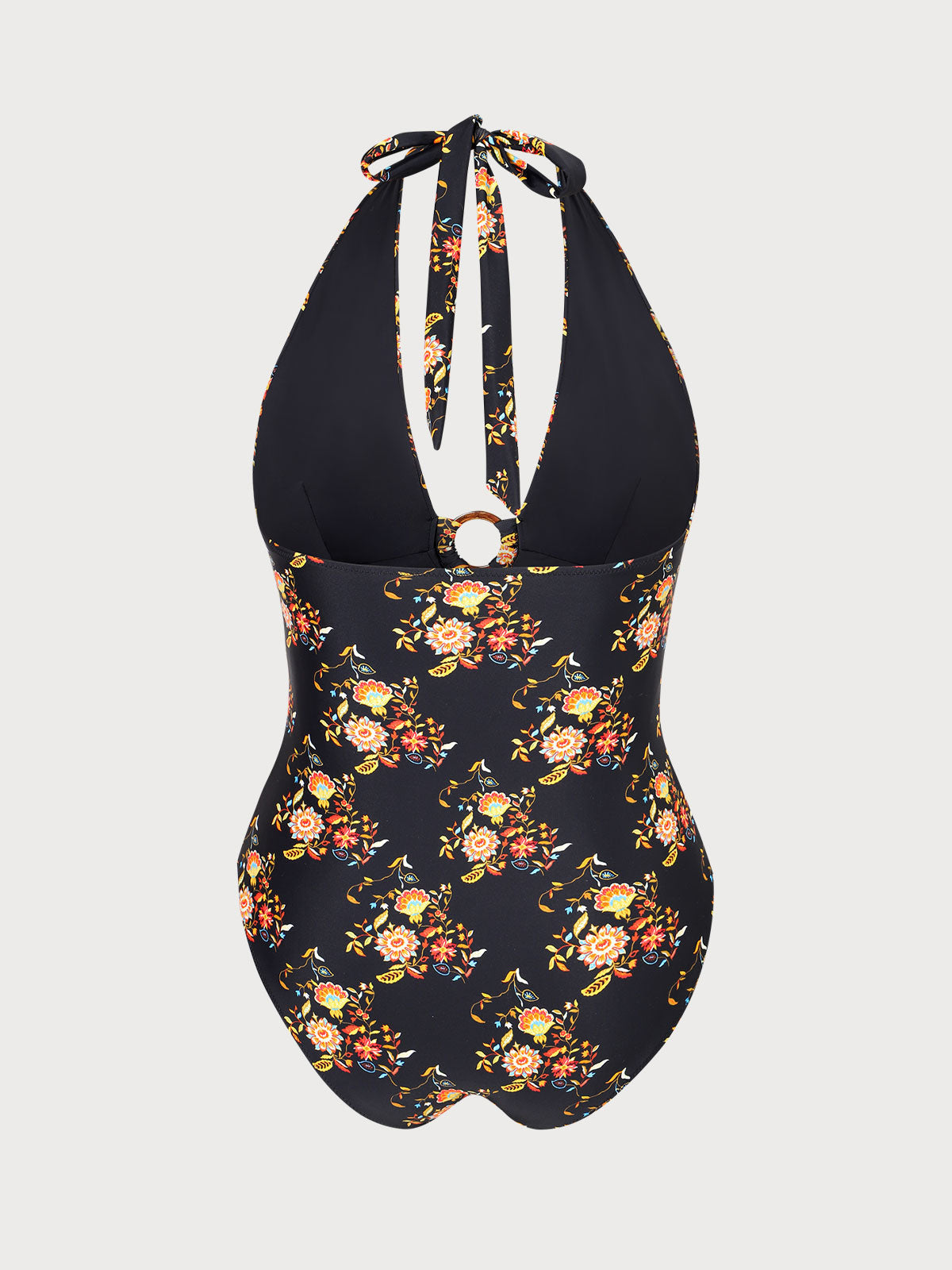 Black O-Ring Floral Halter Plus Size One-Piece Swimsuit