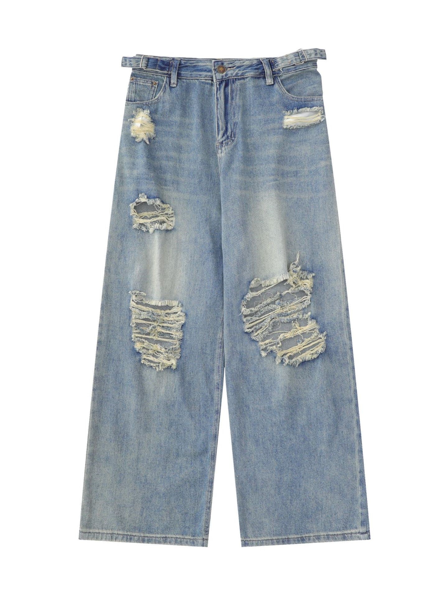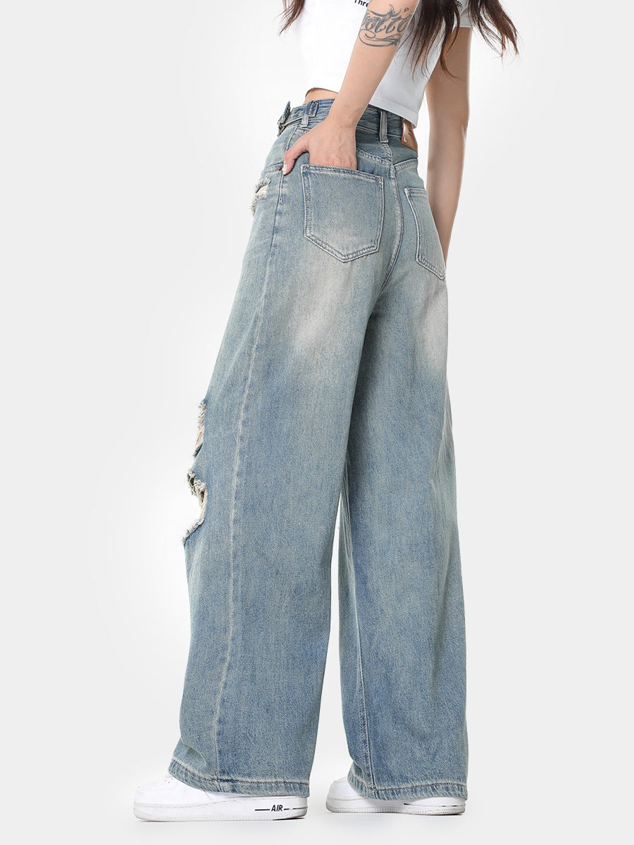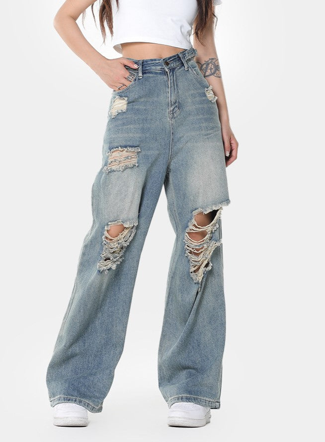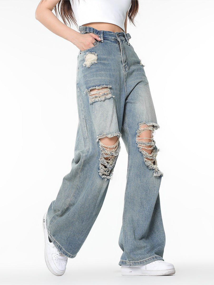 Embrace the edgy. distressed trend with these eye-catching blue denim wide-leg pants. These jeans feature large rips and holes throughout. adding a rebellious touch to their classic design. The high-waisted fit enhances your silhouette. while the loose. baggy leg provides comfort and style. The light wash gives them a vintage feel. making them perfect for creating a retro-inspired outfit. Pair them with a simple white top and sneakers for a casual daytime look or dress them up with heels and a crop top for a night out.