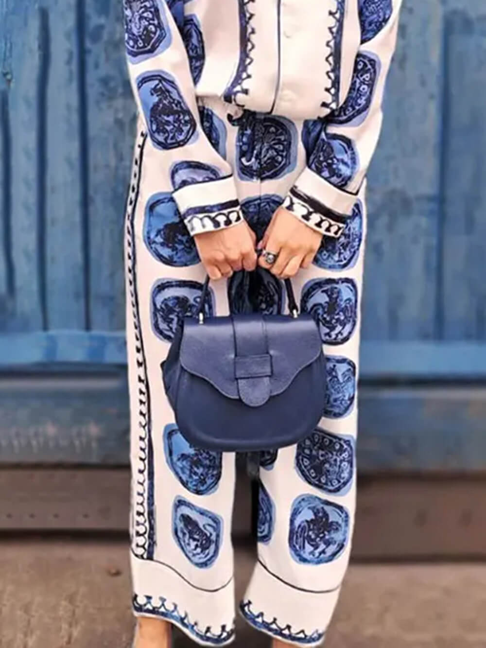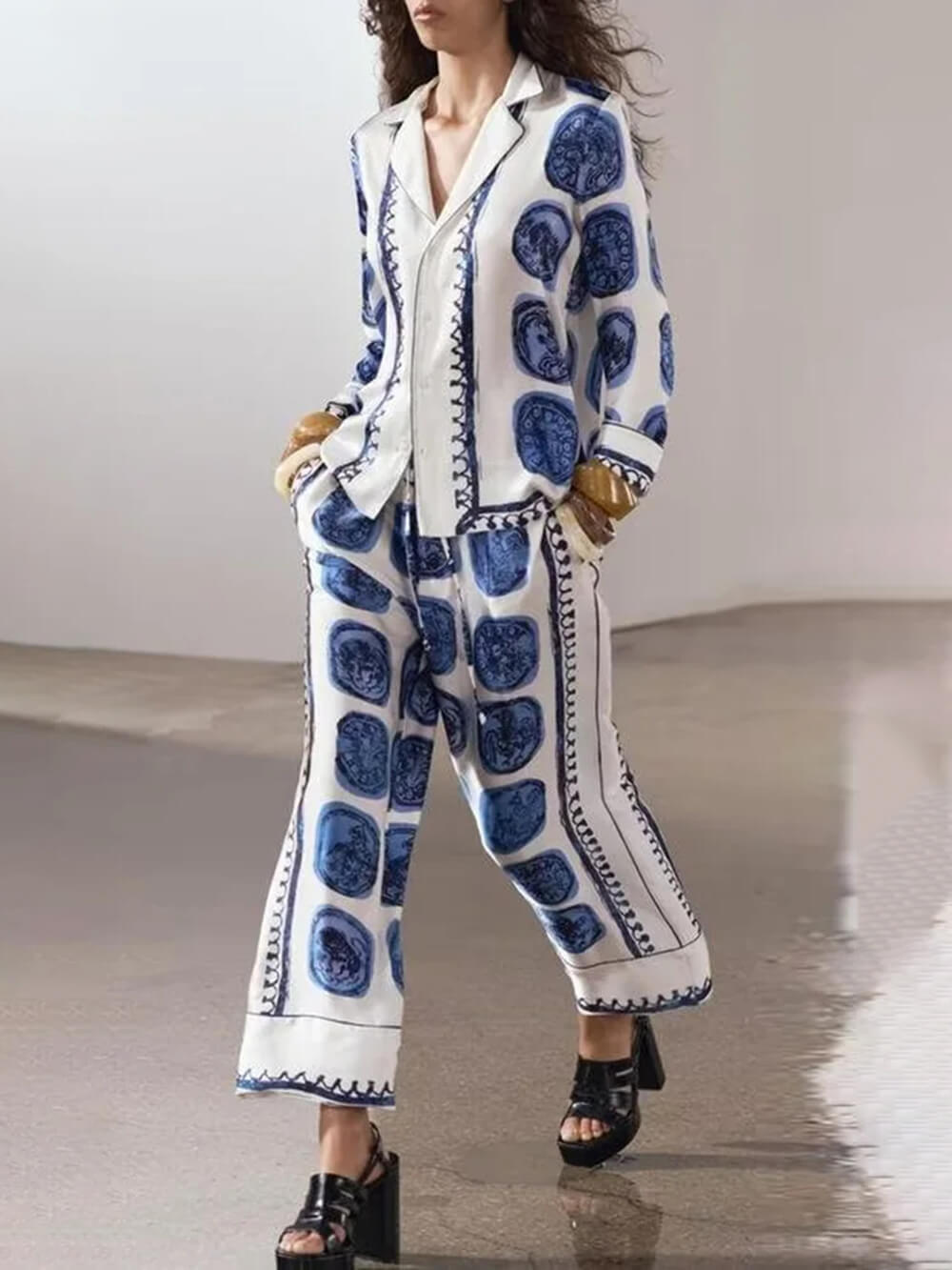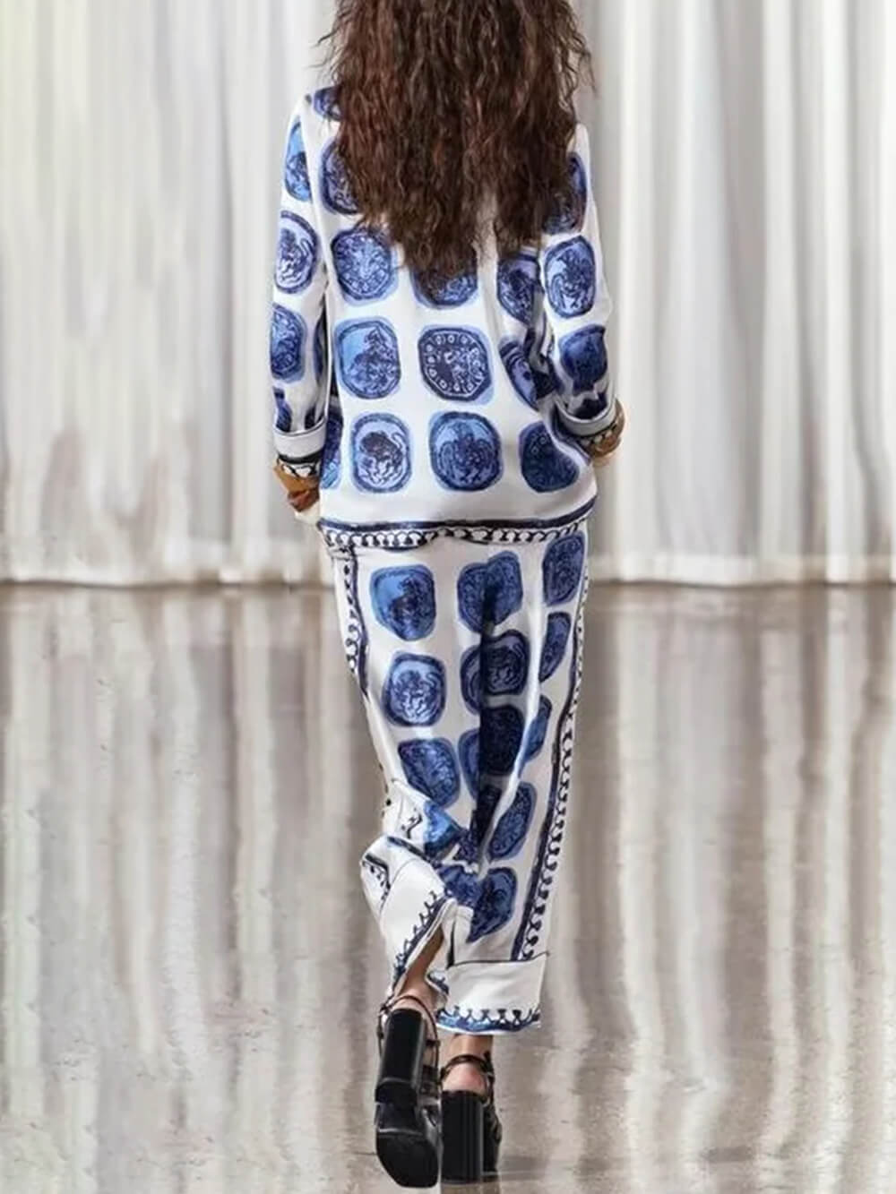 Designed with a unique vintage circle print. these wide-leg pants feature a vibrant print that adds a touch of romance.