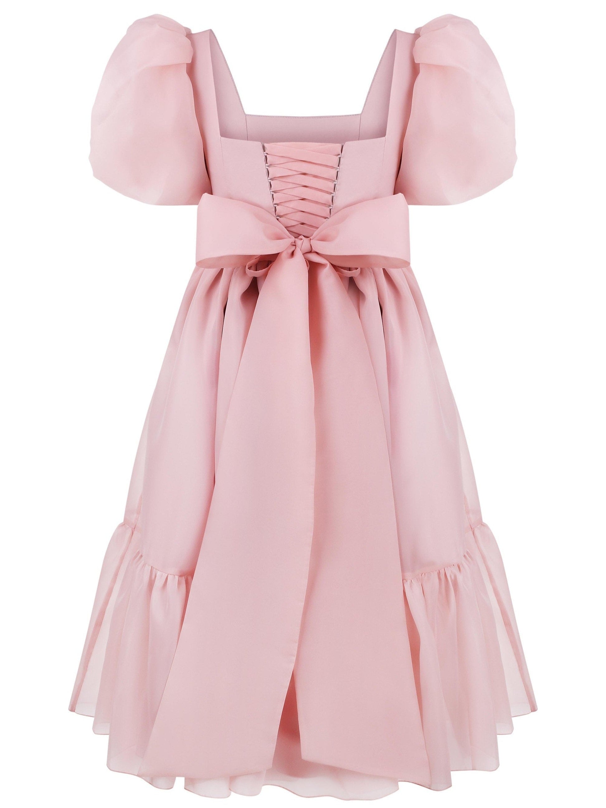 Its dramatic back is adorned with a large. elegant bow that provides a whimsical and playful touch.
