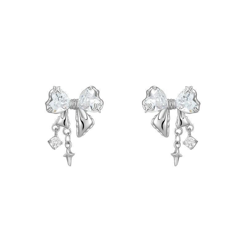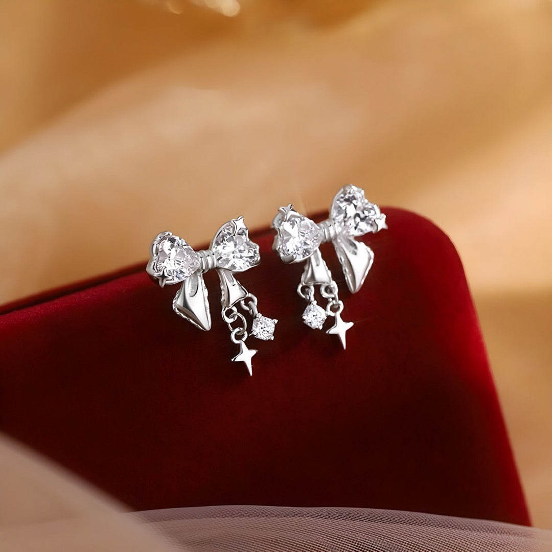 Uniquely crafted stud earrings with a bow design. featuring a dangling star and dangling sparkling clear stone.