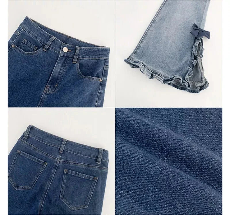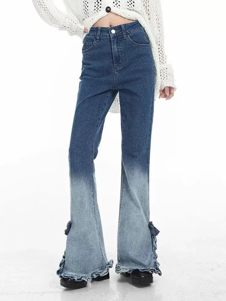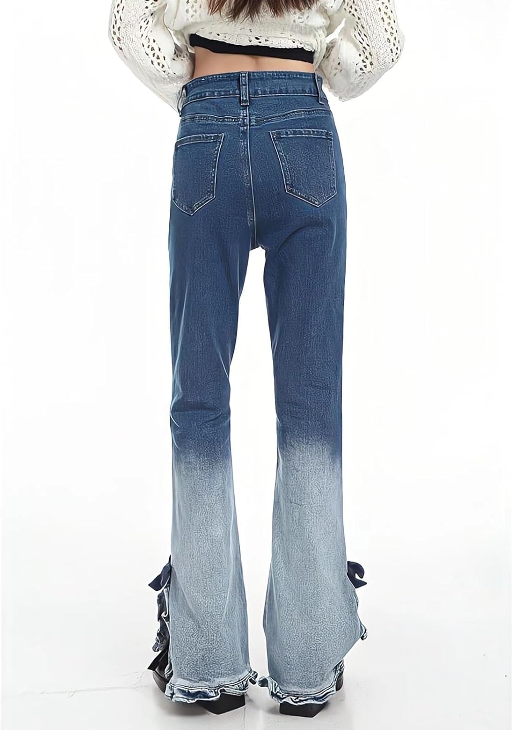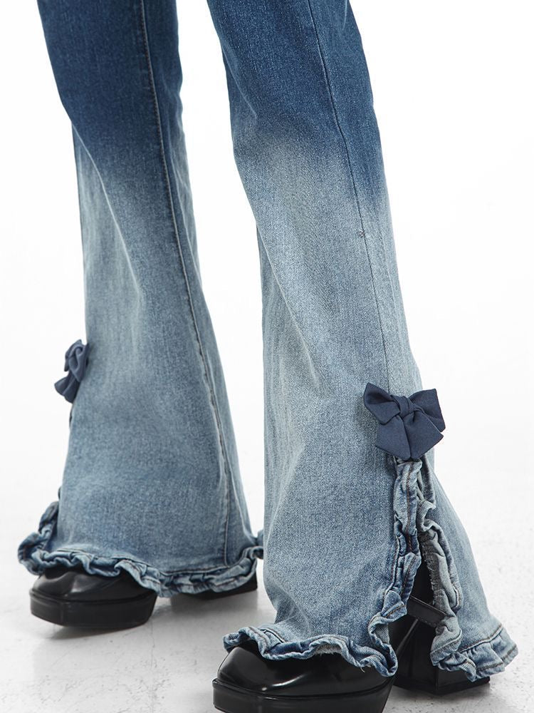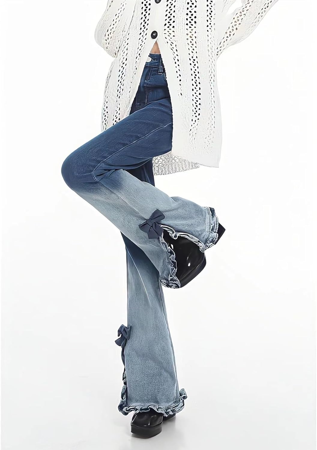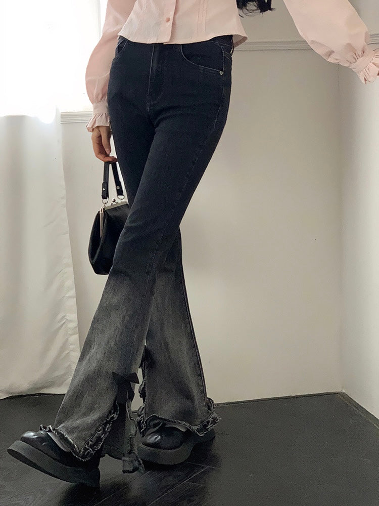 These flare jeans feature a bow detail with a ruffled slit at the bottom hem creating a sleek design.