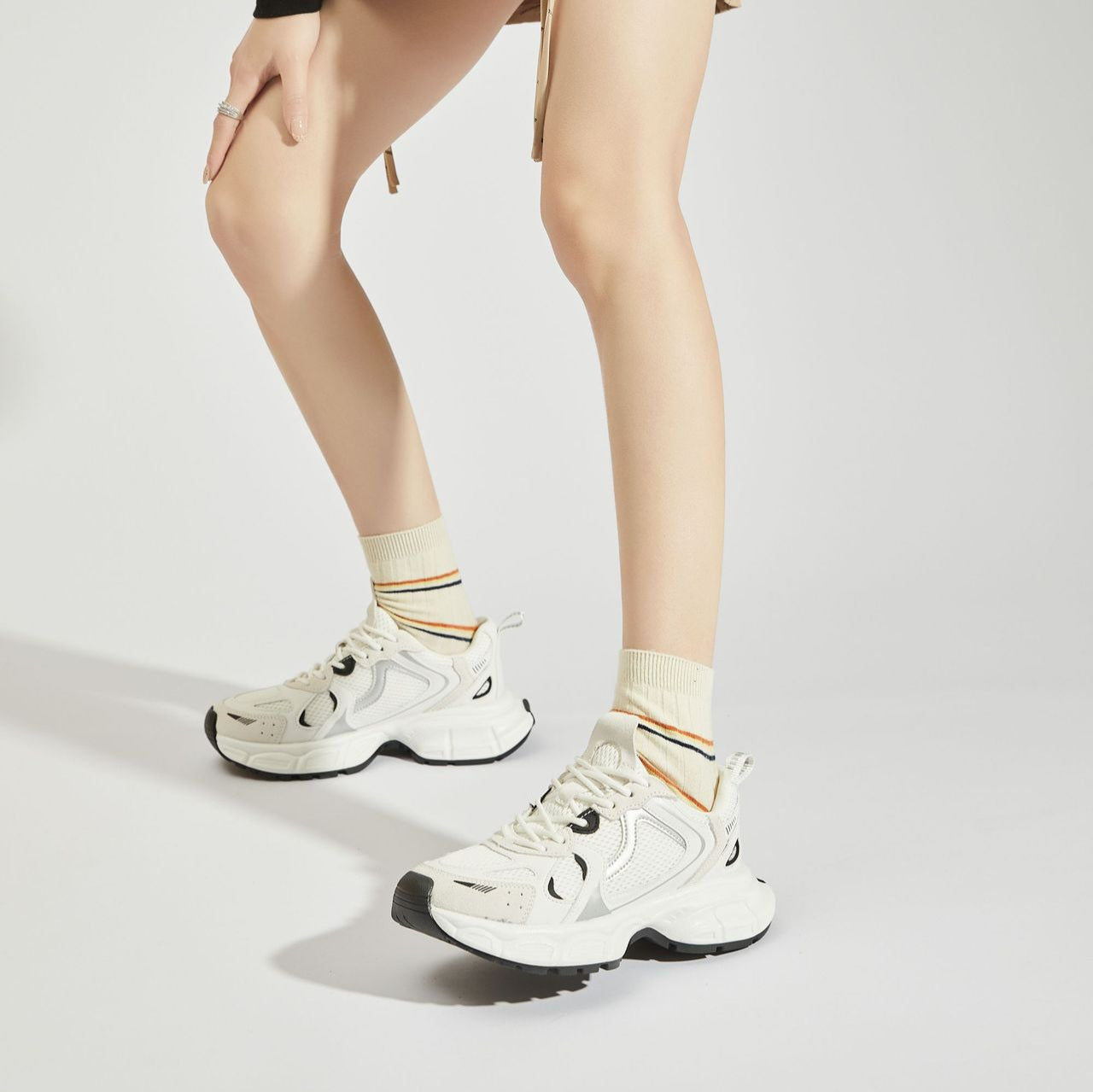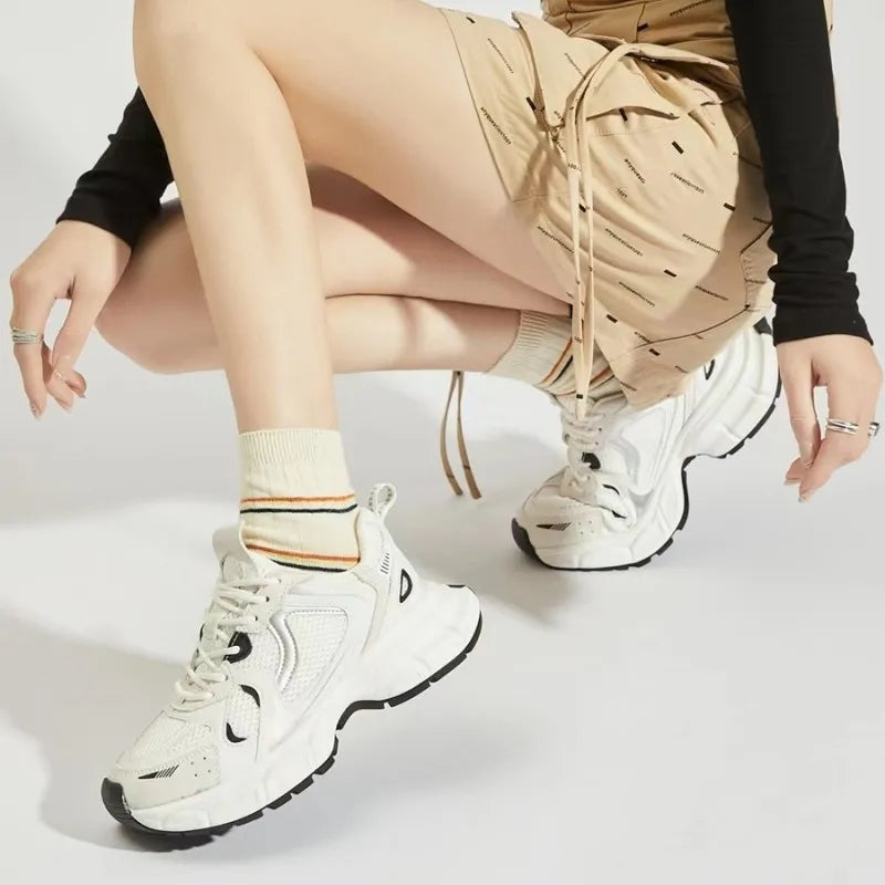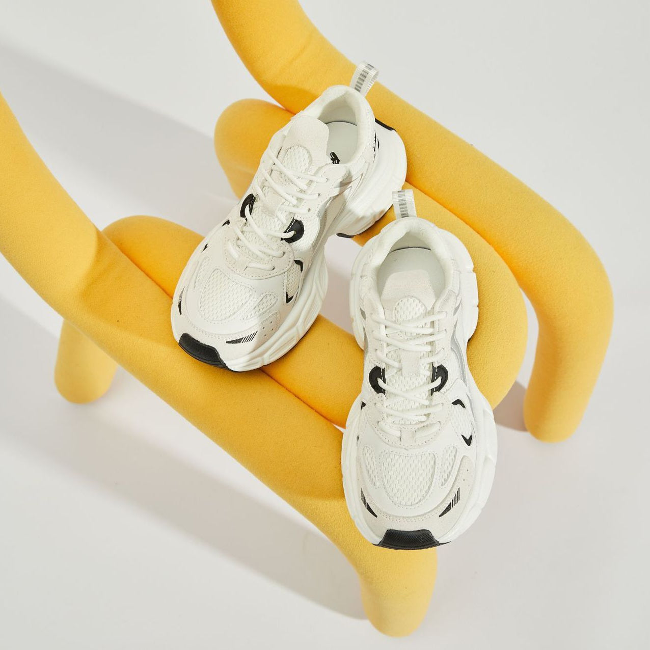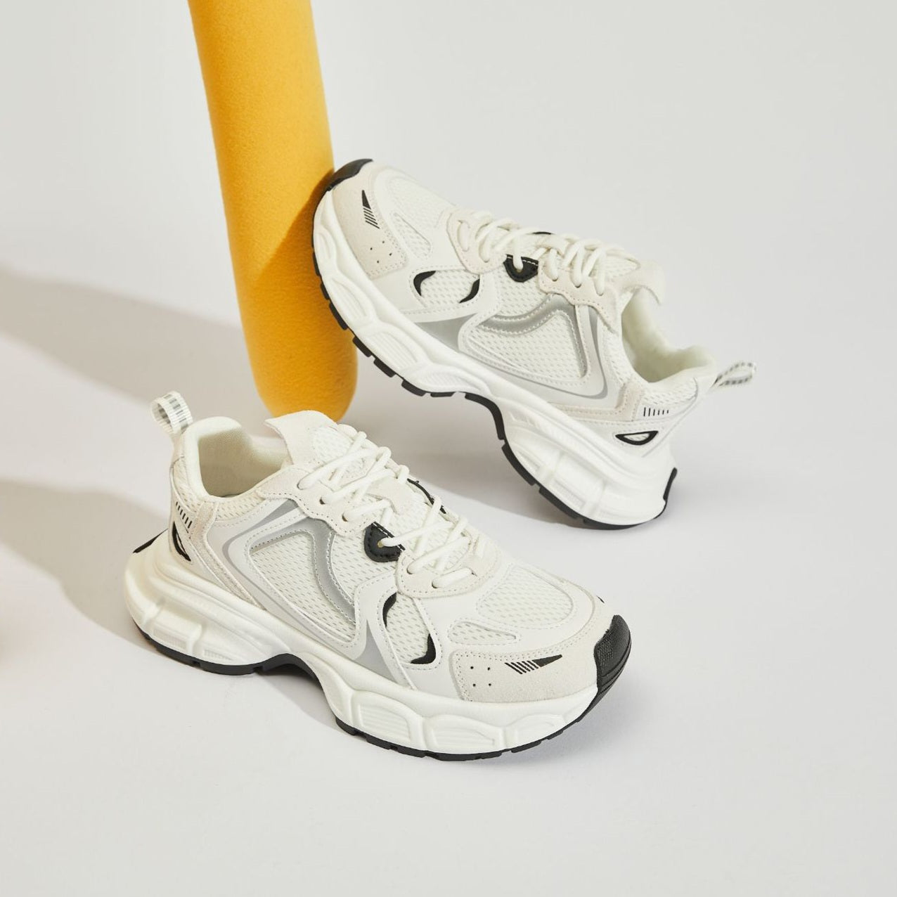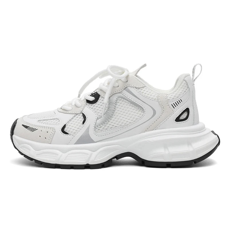 The classic white colourway has subtle black accents. creating a versatile look. The chunky sole is engineered for comfort and style.