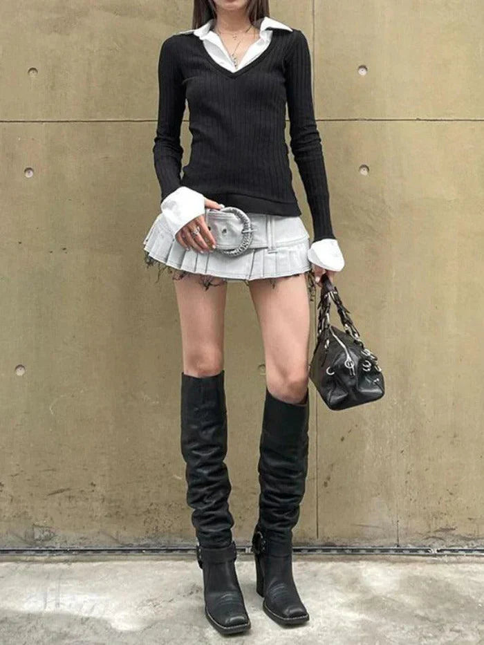 Contrast Color Y2K Polo Neck Splice Faux Two Piece Long Sleeve Knit