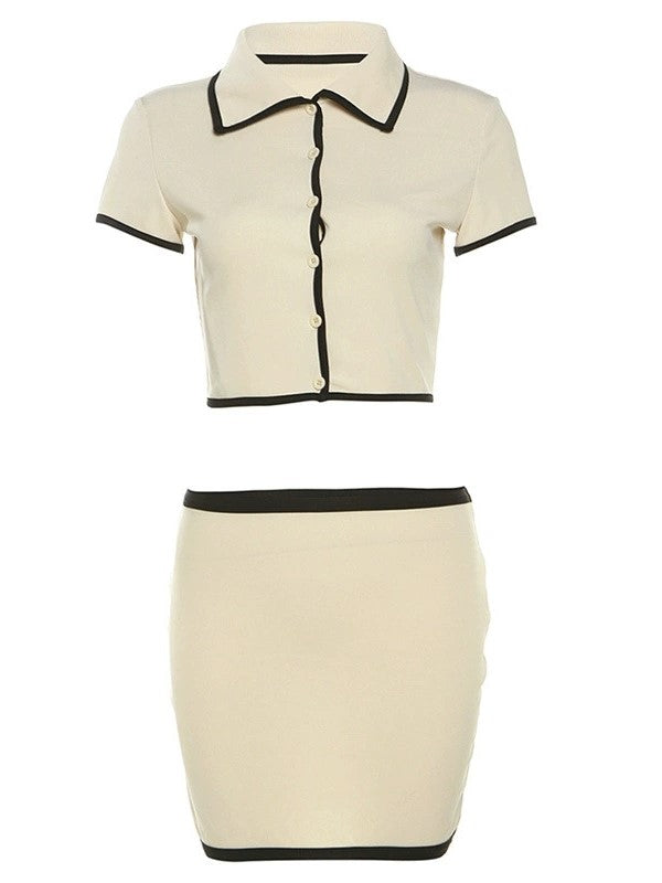 Flattering Mini Skirt: The matching mini skirt offers a playful and youthful silhouette. perfect for showcasing your legs while maintaining a chic and stylish appearance. The contrast design continues. tying the look together seamlessly.