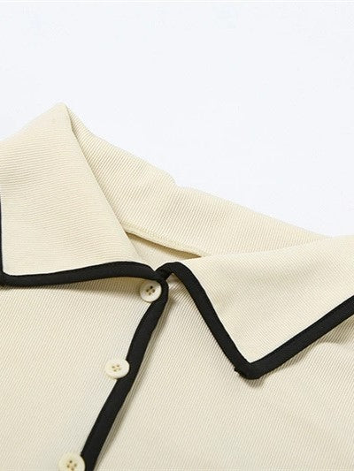 Elegant Lapel Cardigan Top: The cardigan top is designed with a sophisticated lapel collar. adding a touch of vintage-inspired elegance. Its button-down front and contrast details create a polished and refined look.