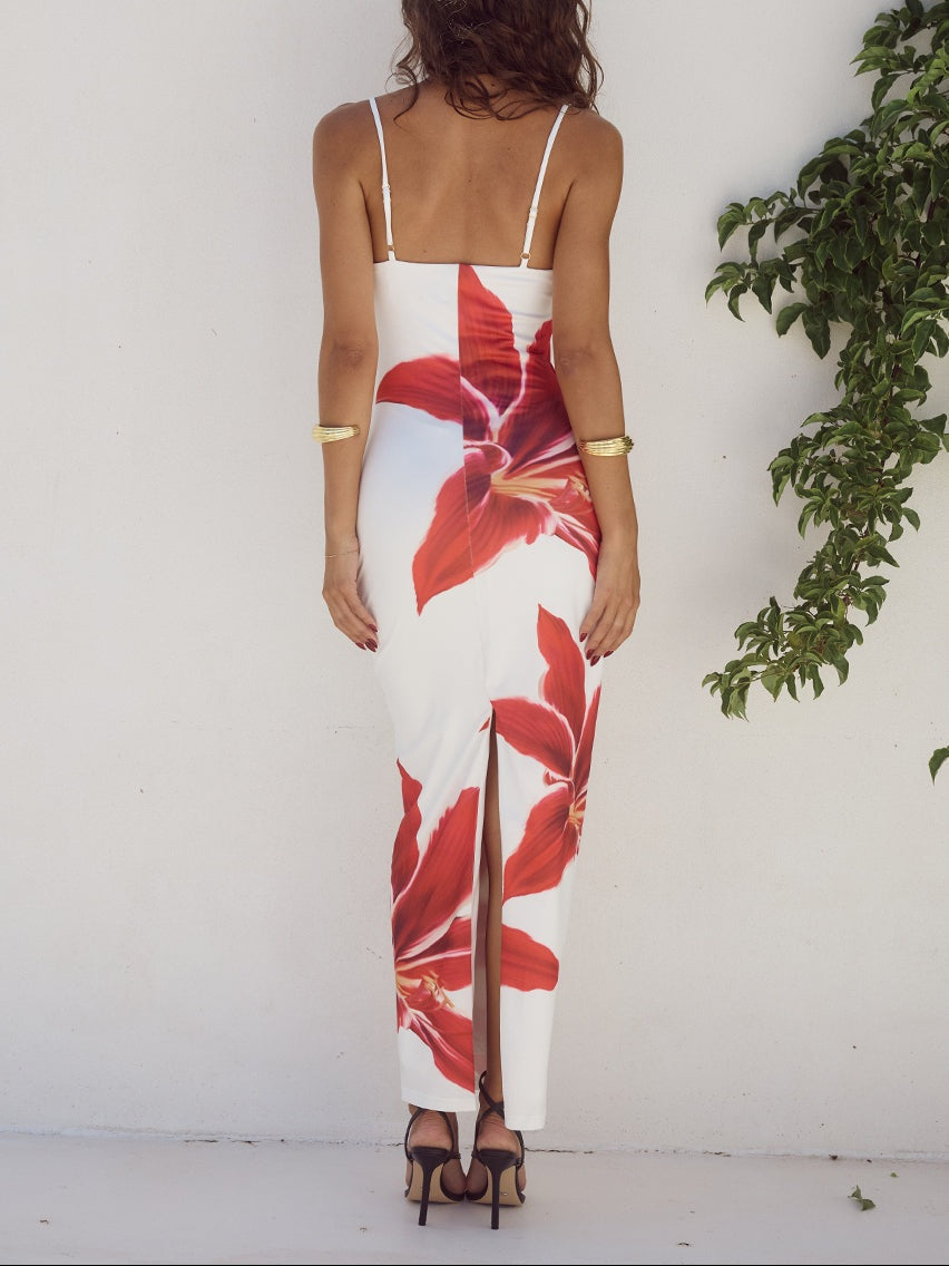 This Deia Midi Dress is crafted from a luxe fabric. with thoughtfully placed vibrant flower print bringing a fresh and feminine charm. perfect for adding a splash of color to any occasion.