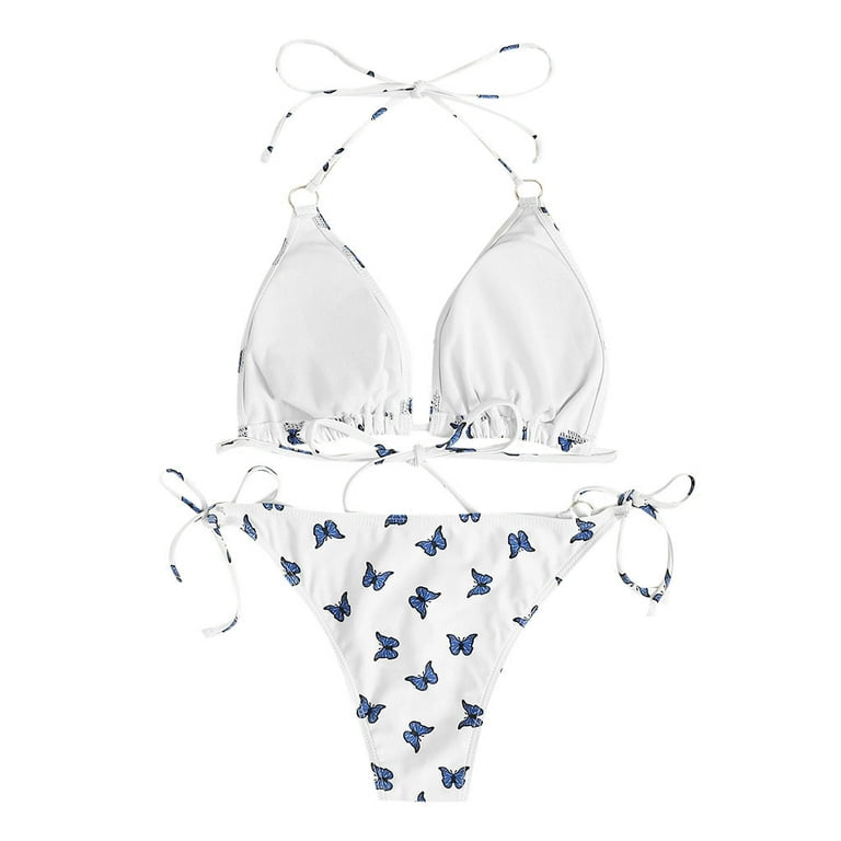This playful bikini features a charming butterfly print on a white background. The cheeky bottom and string-tie top offer a stylish and comfortable fit. perfect for a day at the beach.