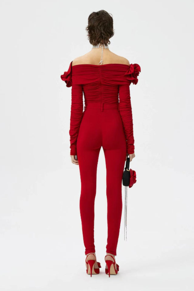 Large floral appliqués feature on many of our designs. Fabric rosettes are the focal point of this off-shoulder crop top. which is fully ruched and features a cutout bodice.