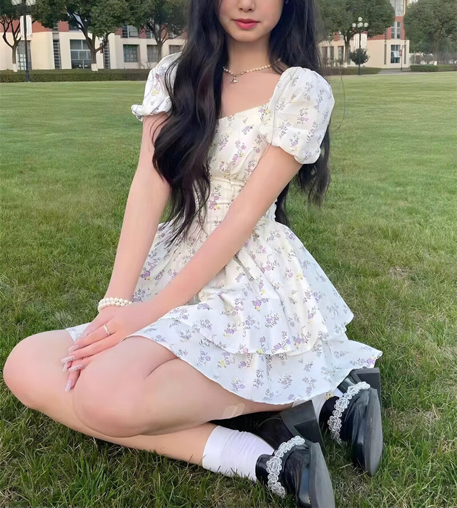 Floral Puff Sleeve Corset Tiered Mini Dress