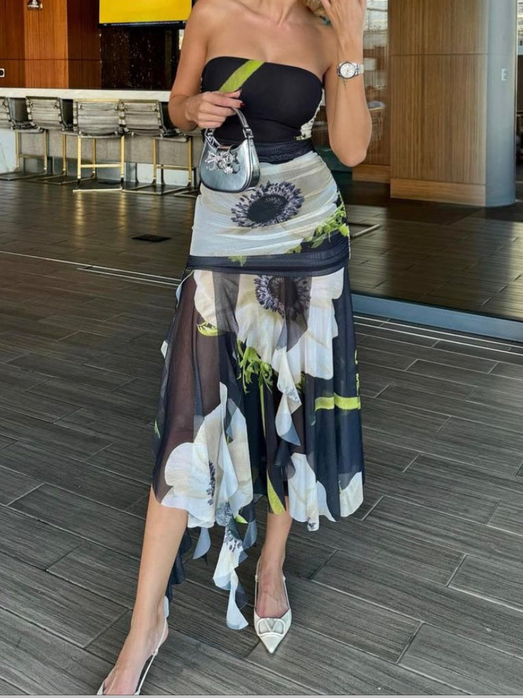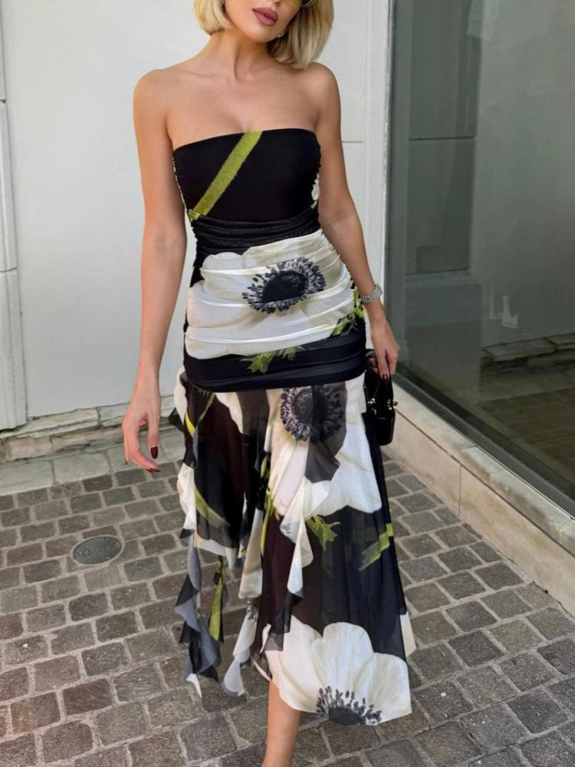 Flower Mesh Asymmetric Ruffle Hem Mermaid Dress