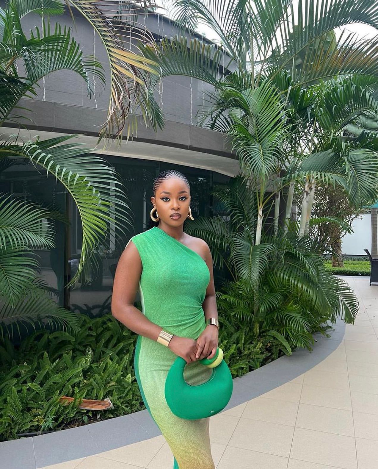This one-shoulder form-fitting dress features a gradient colour scheme. transitioning from light to darker colours.