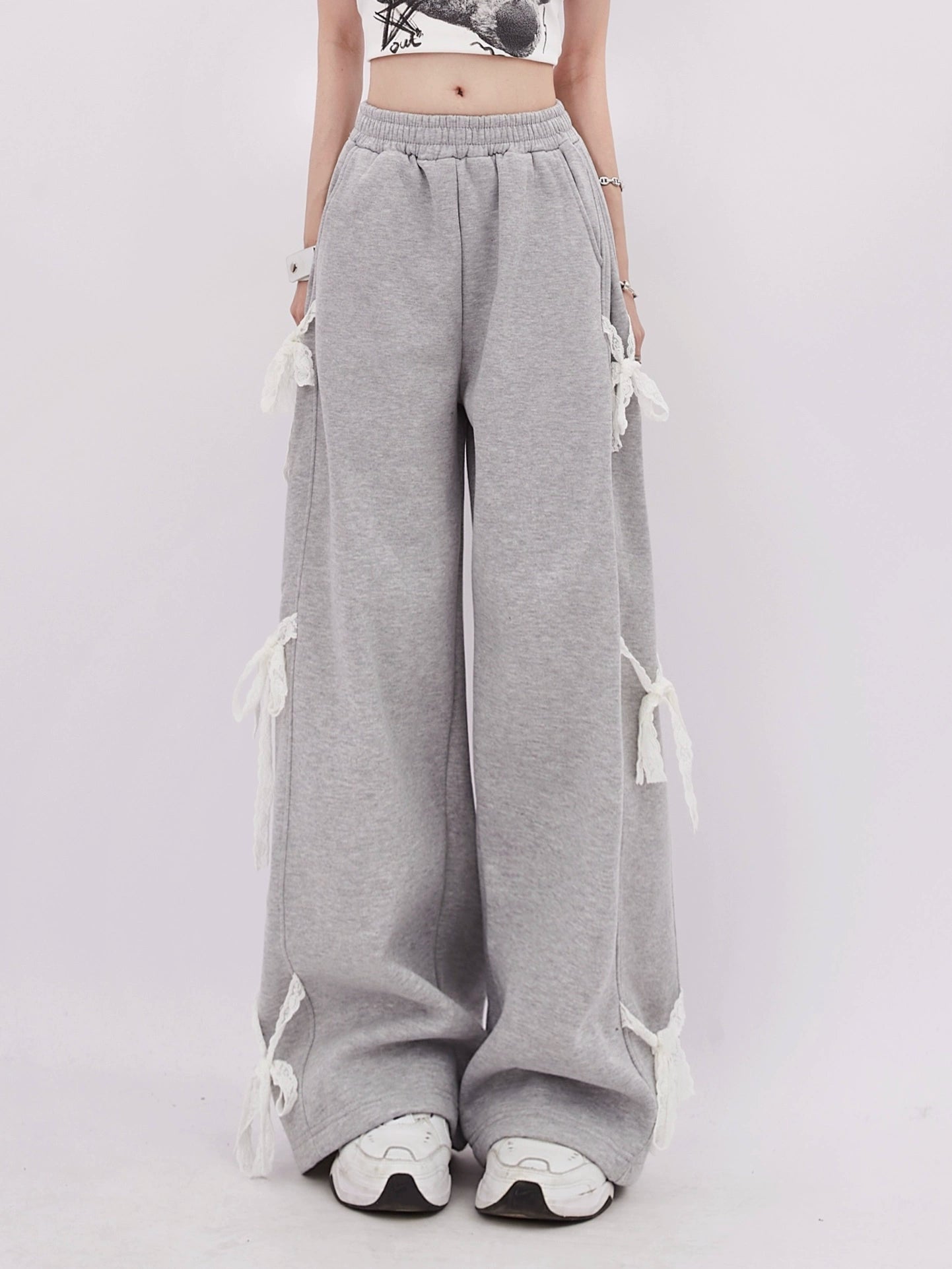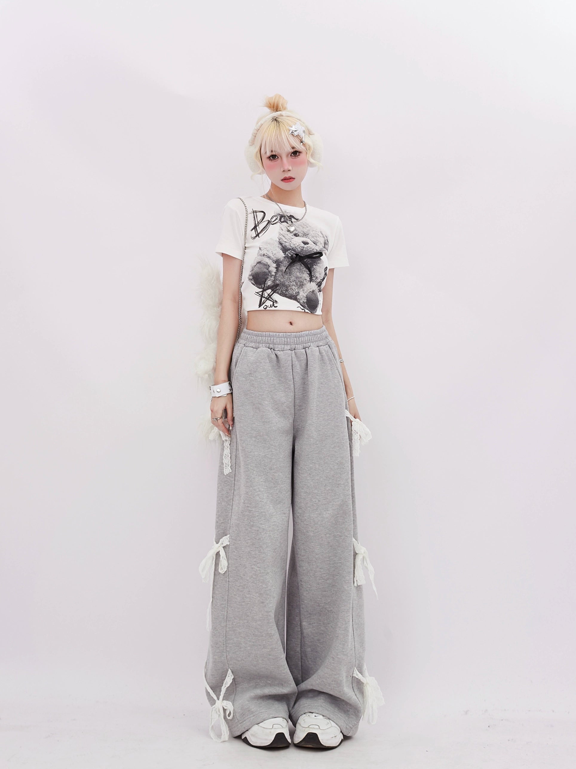 These sweatpants feature unique bow ties along the sides. adding a touch of playfulness and femininity.