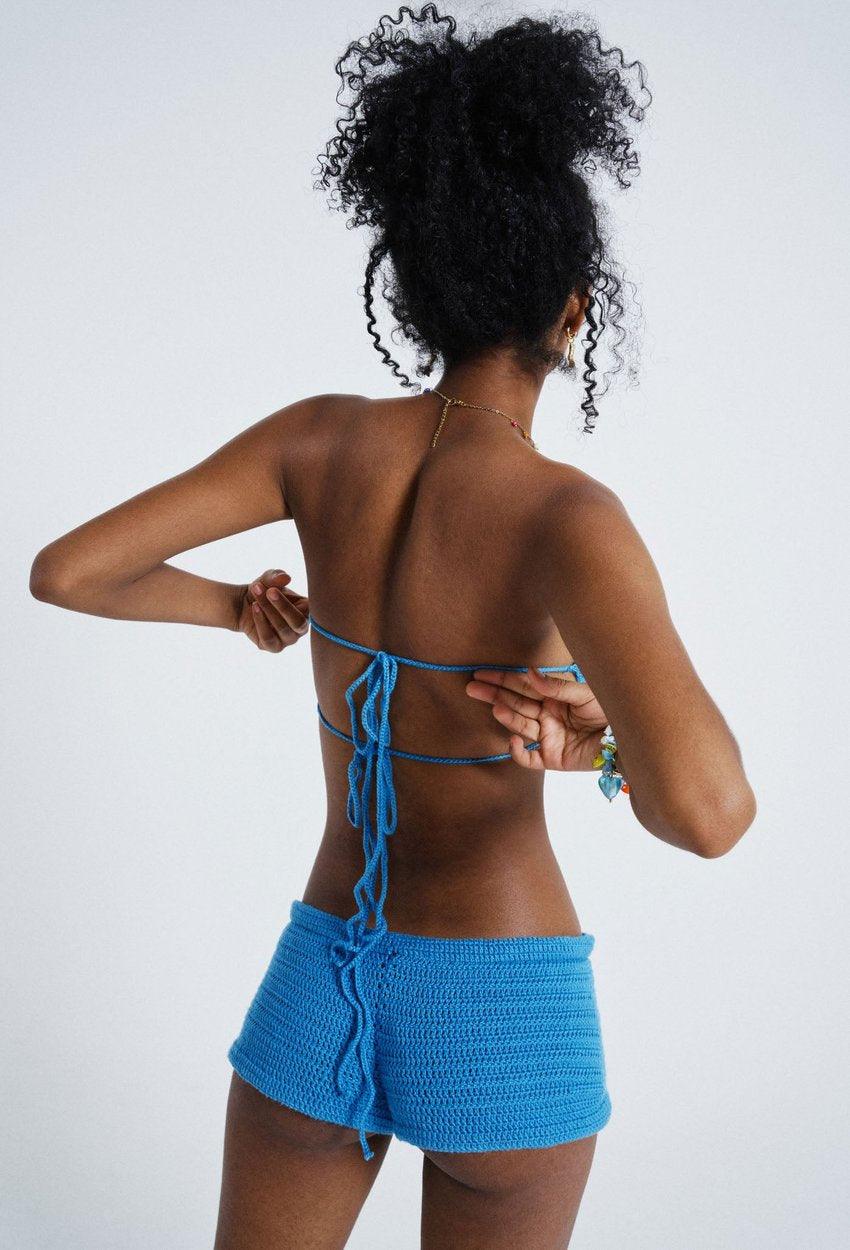 This vibrant bikini features a light blue tube top and matching shorts adorned with a beautiful hibiscus floral pattern. The comfortable fit and stylish design make it perfect for summer days and outdoor activities.