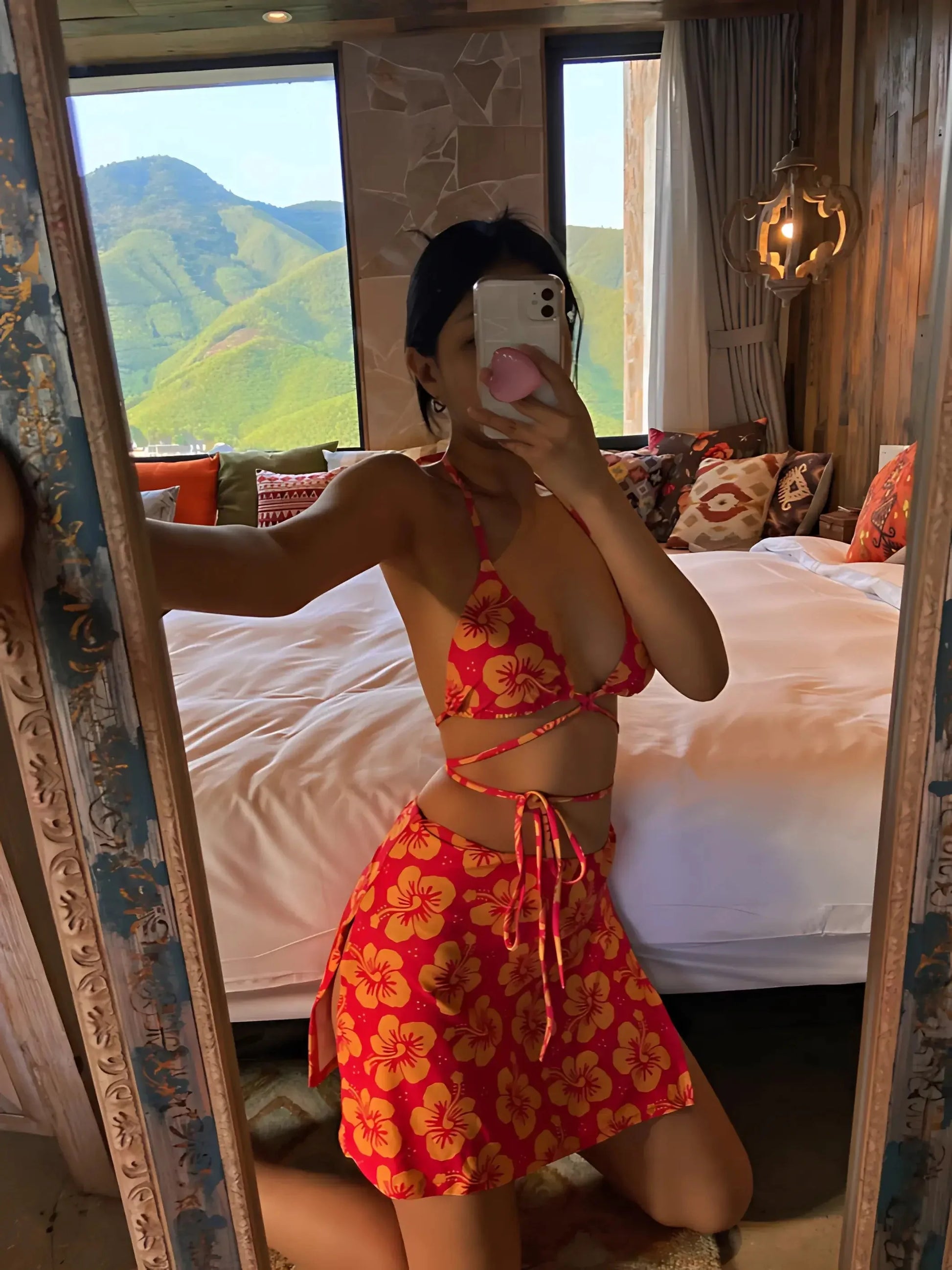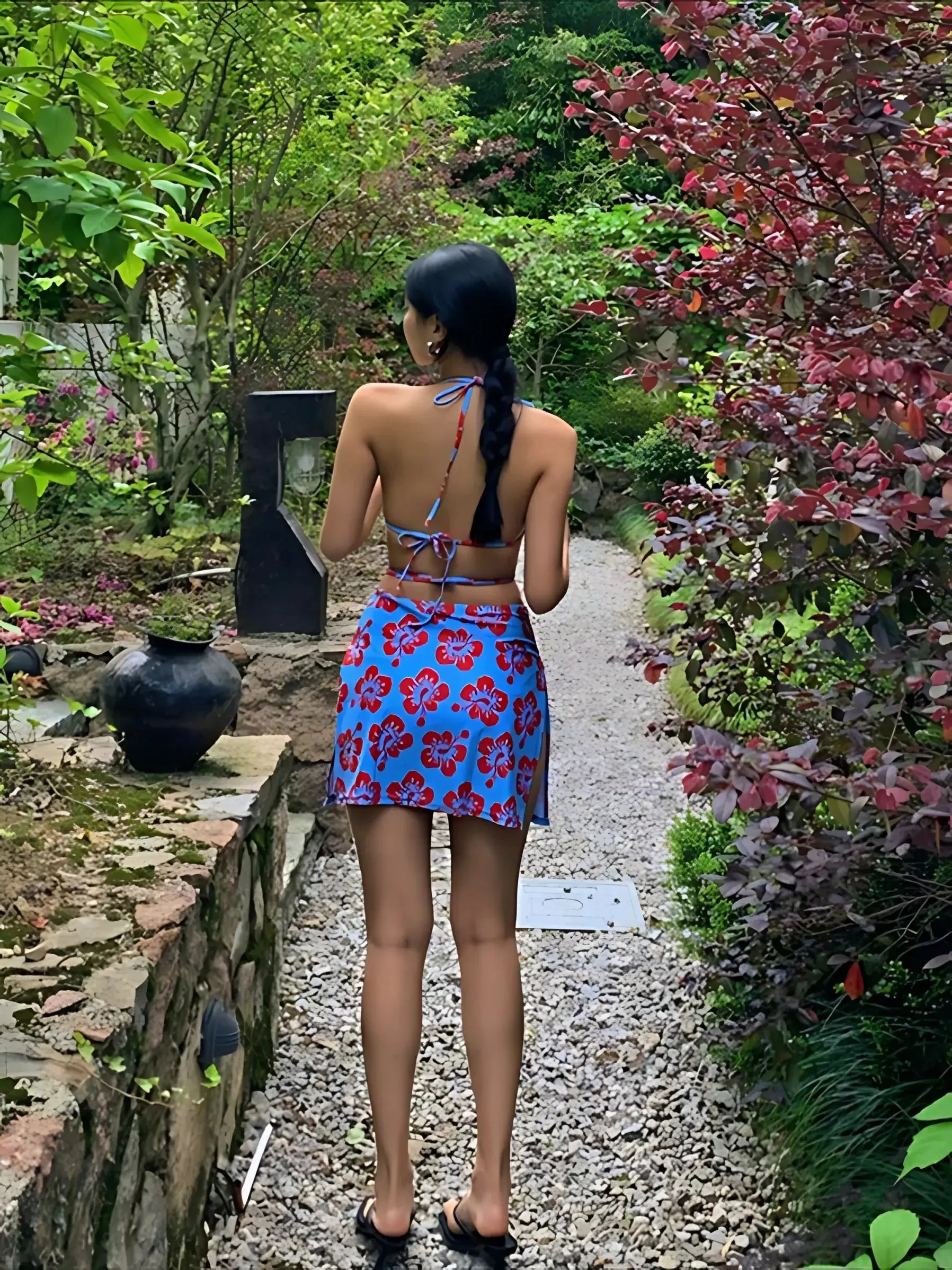 This 3 piece floral print bikini set features an adjustable triangle halter top with a criss-cross back and cheeky bottom.