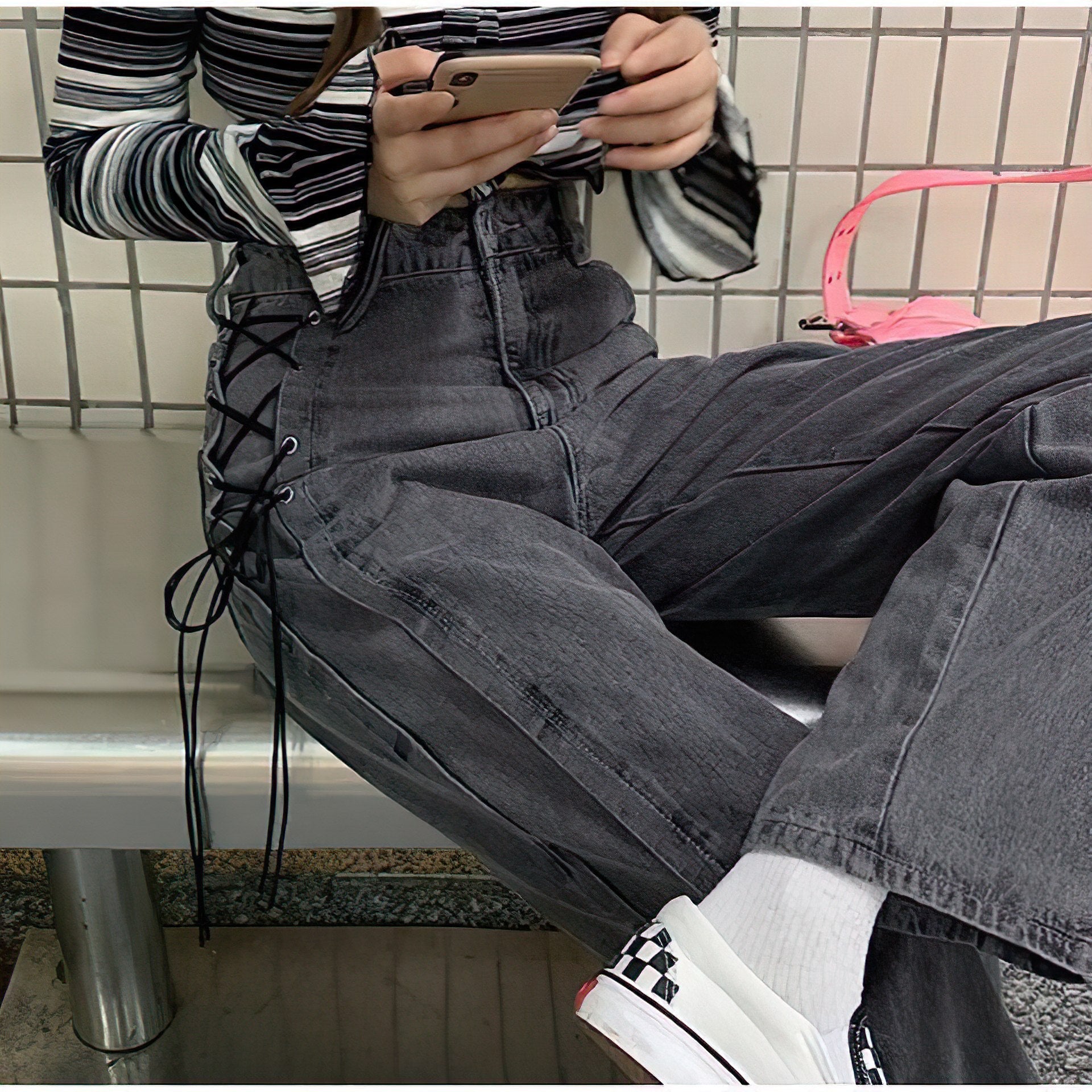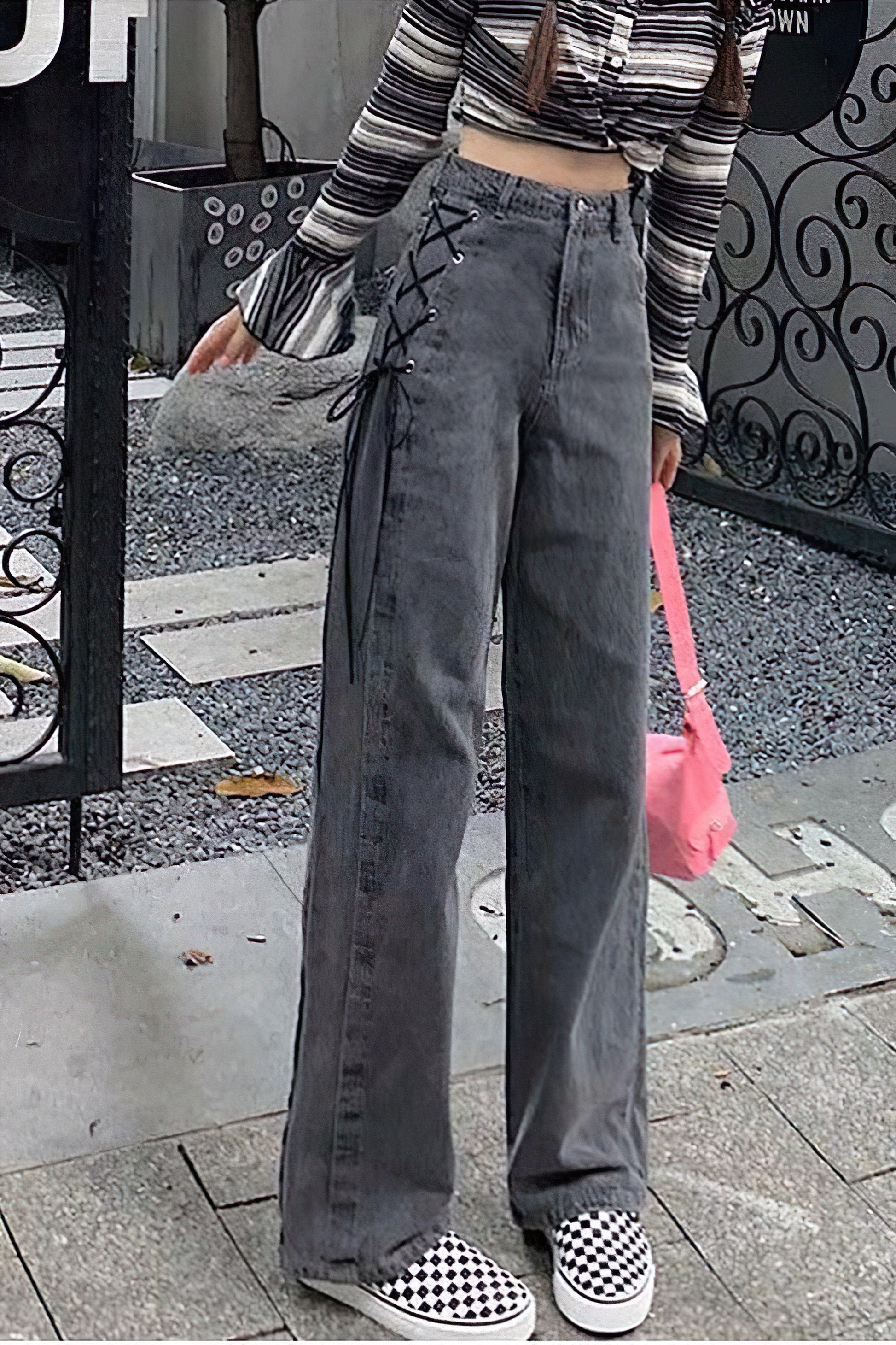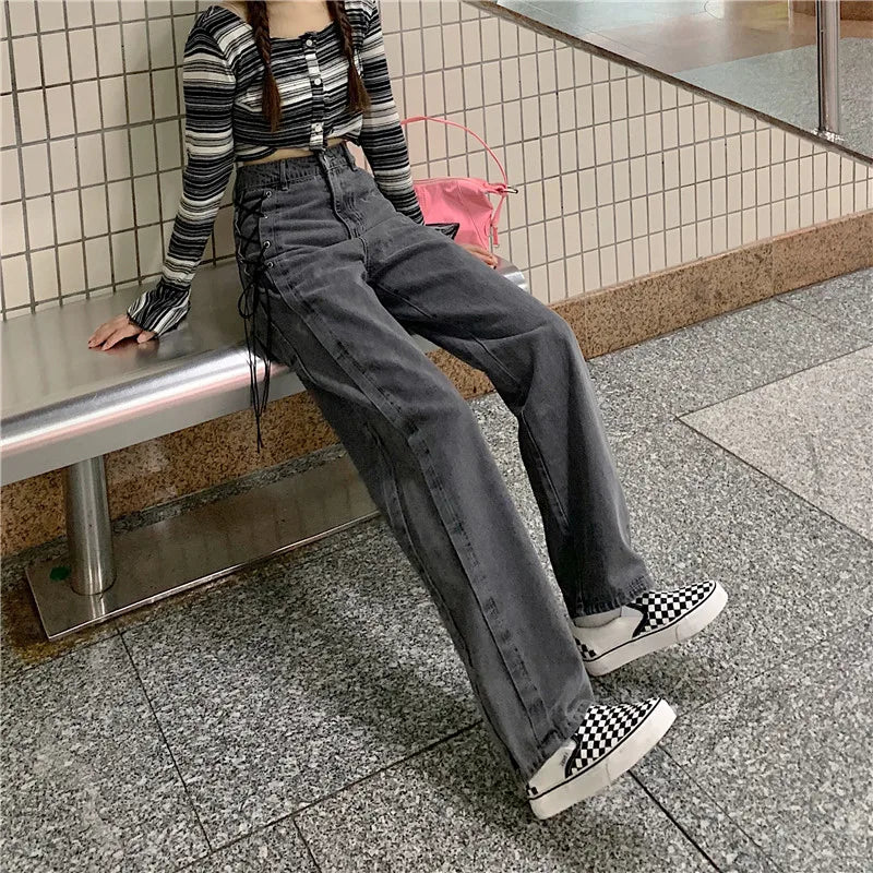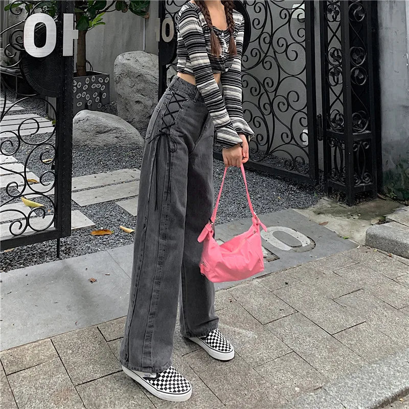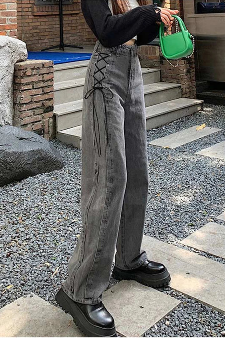 The High waist side lace-up jeans are a trendy and stylish option that combines the flattering silhouette of high-waisted jeans with the unique detail of side lacing.