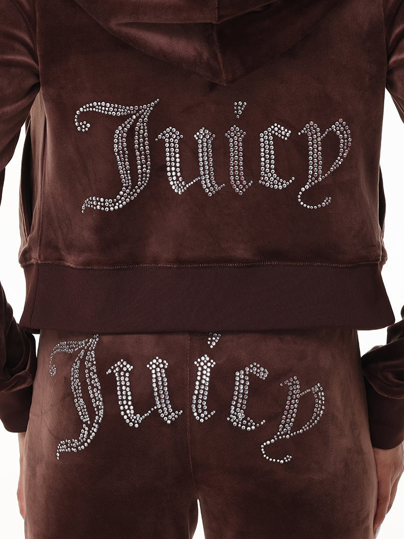 The iconic Juicy embellishment brands the back of this velour hoodie and pants giving them a luxe twist.