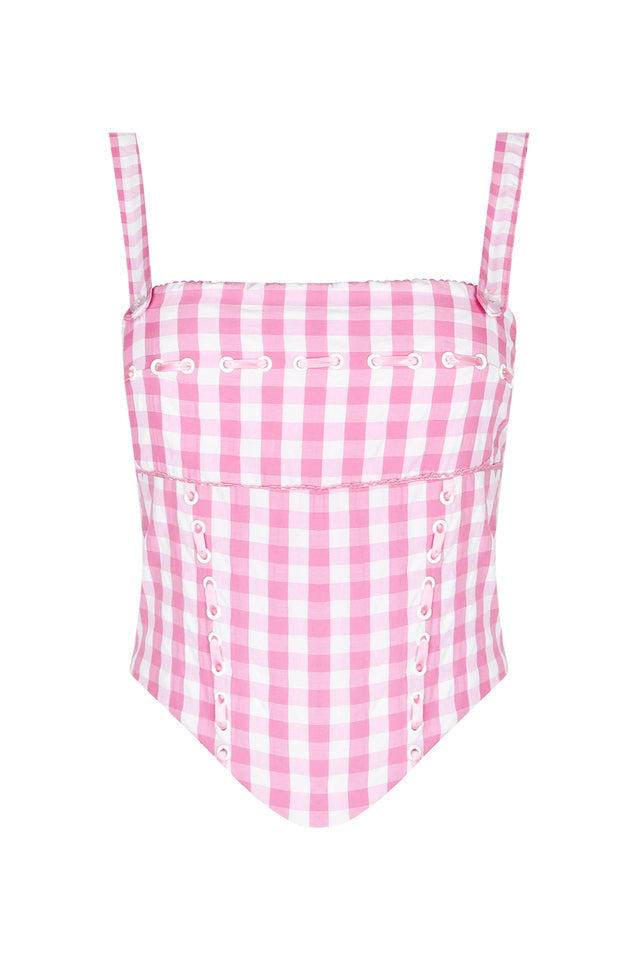 In a gorgeous strawberry shortcake gingham. 'Lottie' is the prettiest corset that you're going to want to team your favourite jeans with. It's made from a luxurious airy viscose and the fitted. boned bodice cinches your waist.