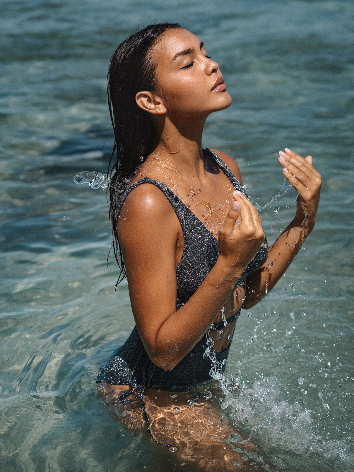 As this shimmer fabric is delicate. avoid rough surfaces like rocks & pool edges. to minimize snagging. and please be careful when wearing jewelry and bags as this special fabric can catch.