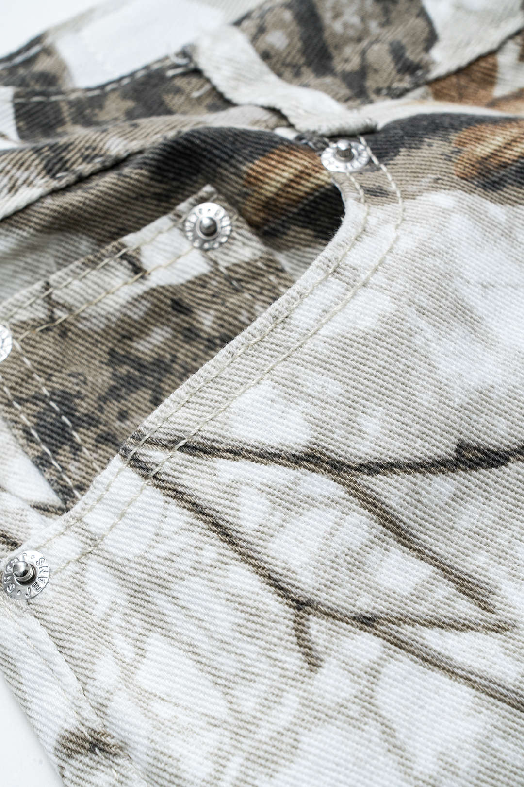 Branch Print Denim Button Pocket Wide Leg Trousers