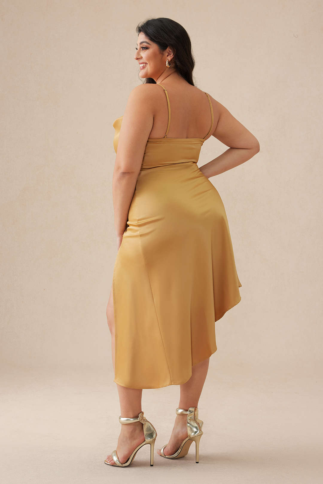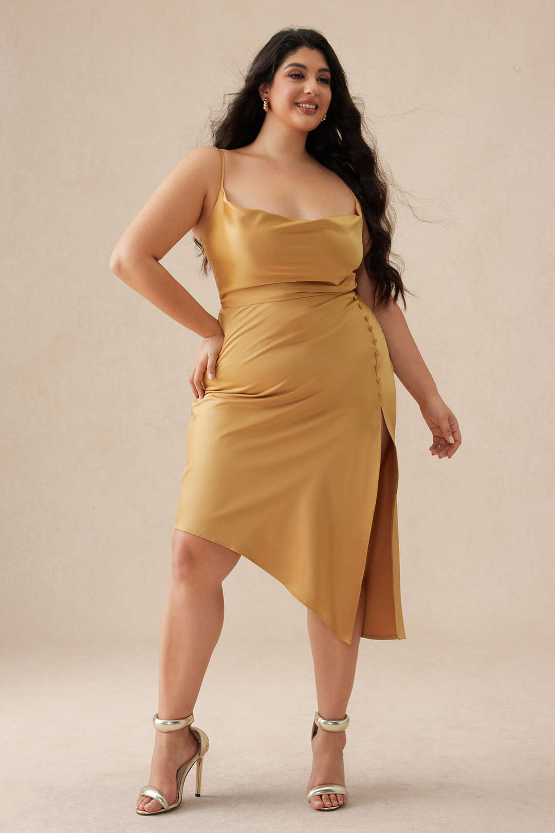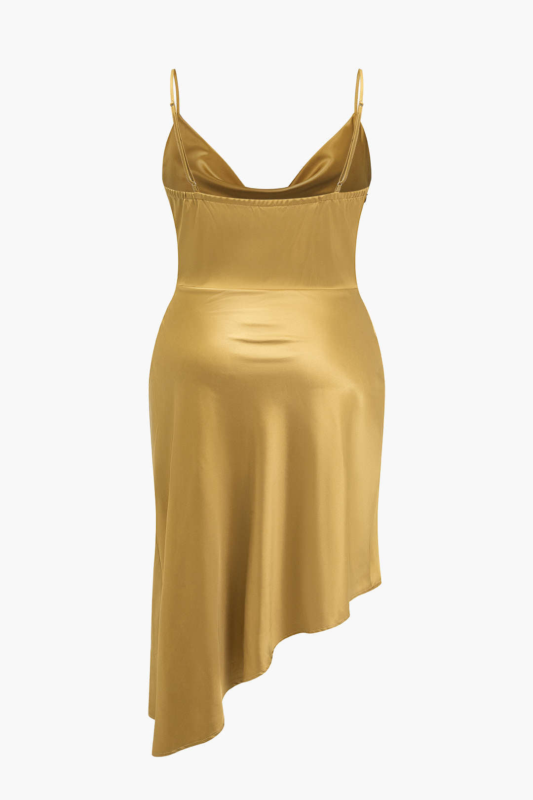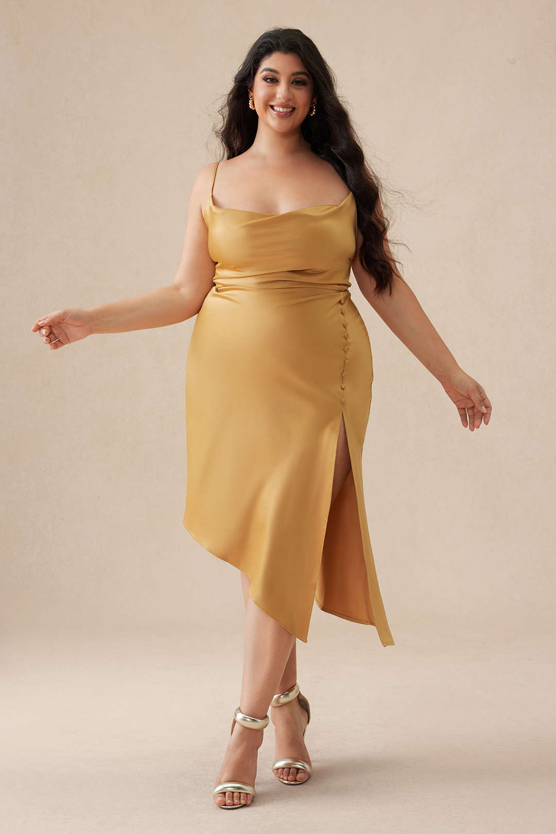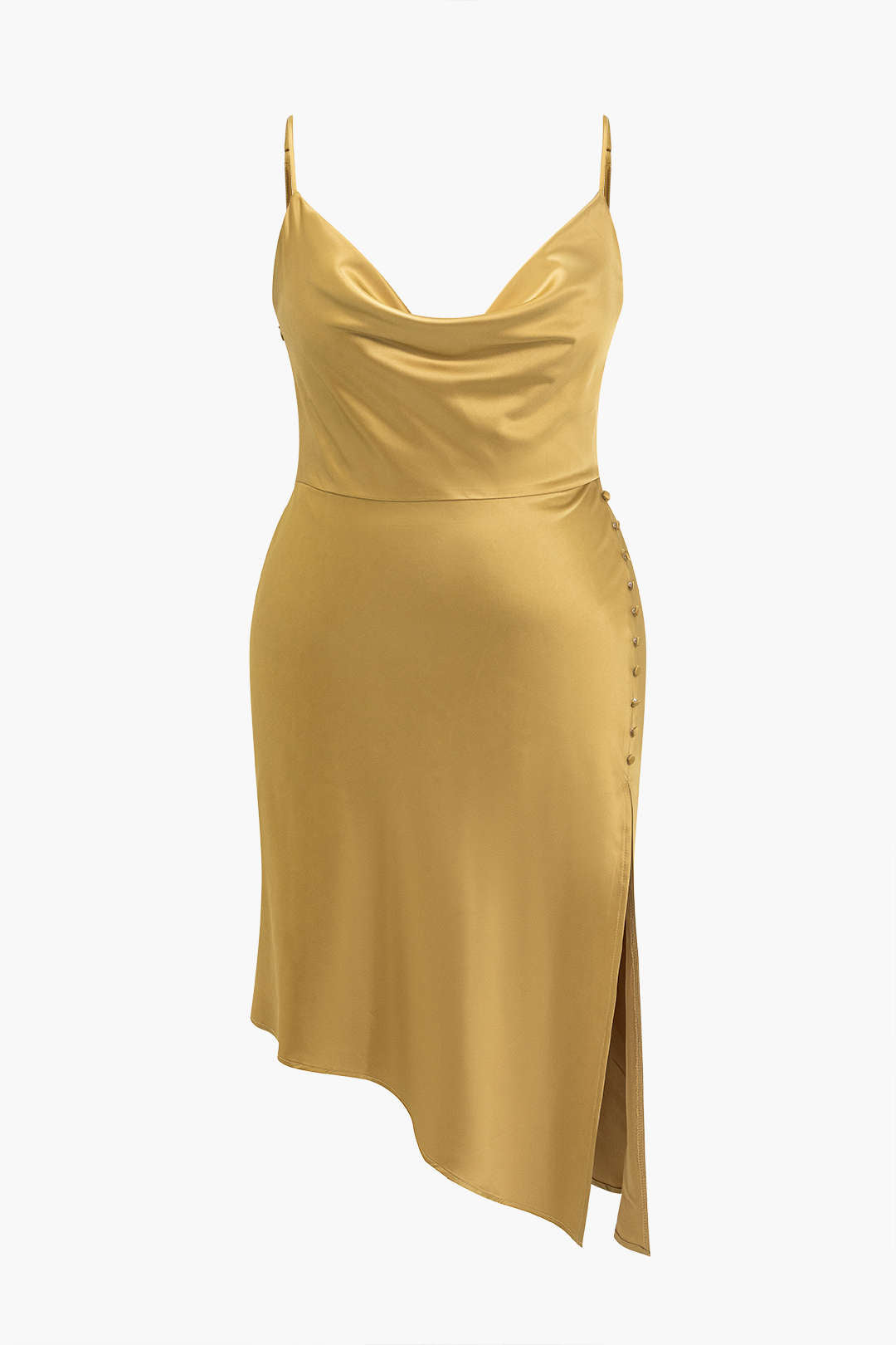 Plus Size Solid Button Draped Cowl Neck Midi Dress