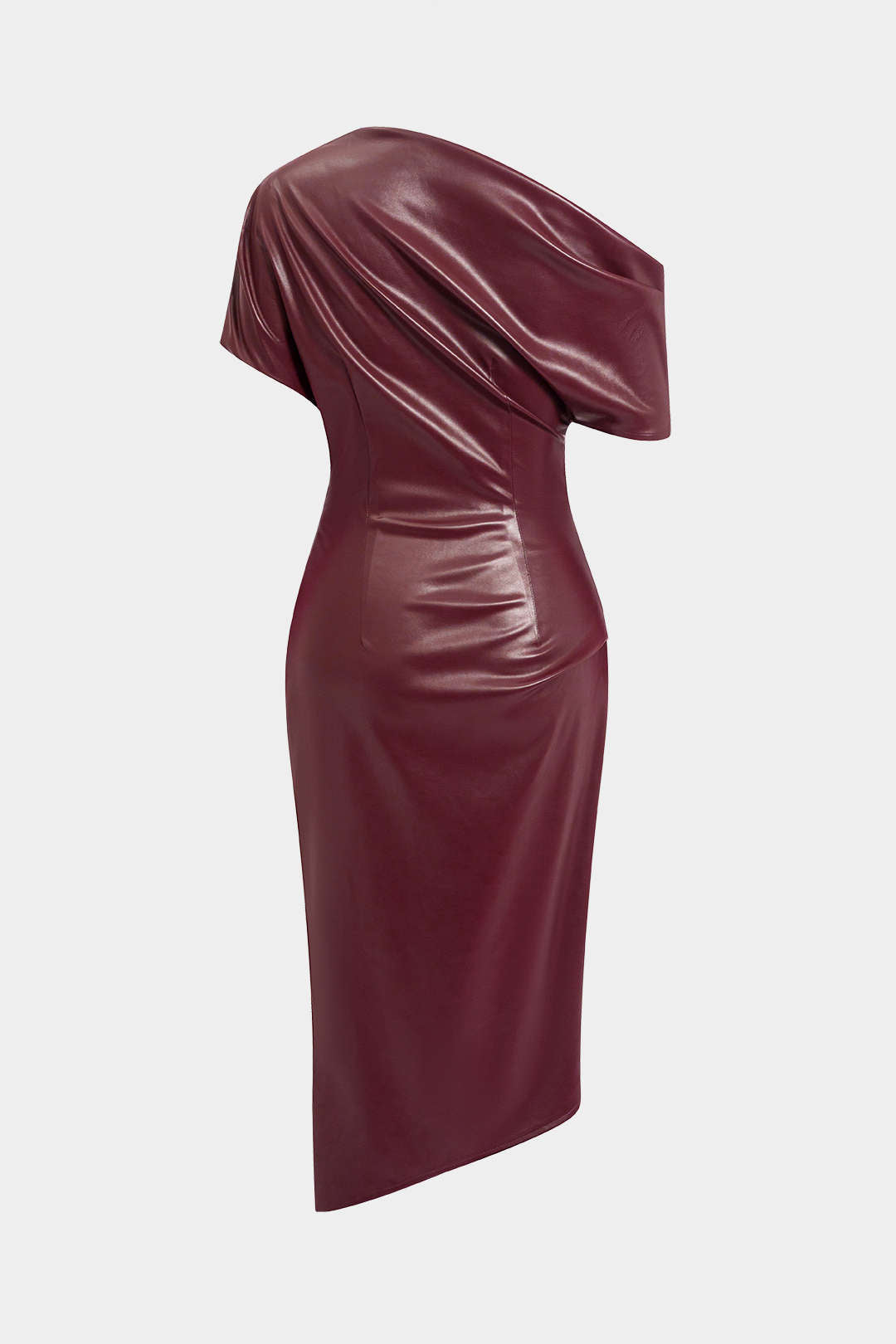 Asymmetrical Shoulder Faux Leather Bodycon Dress