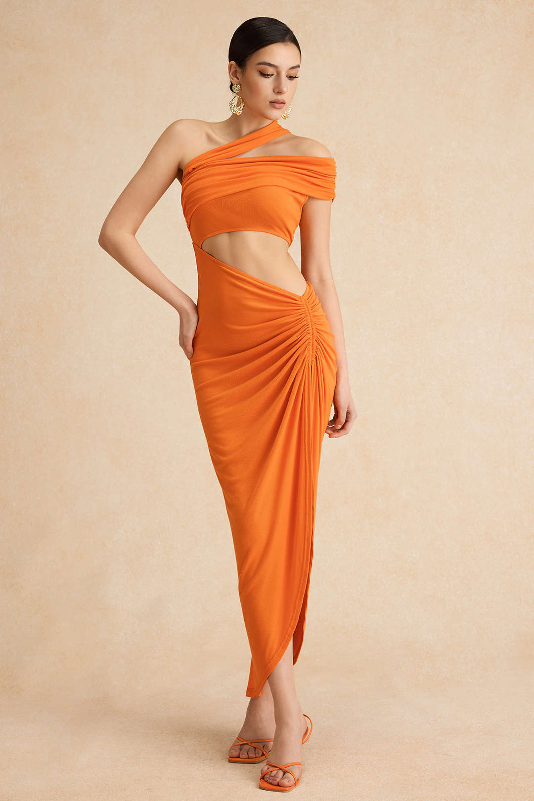 Ruched Asymmetrical Cut Out Slit Midi Dress