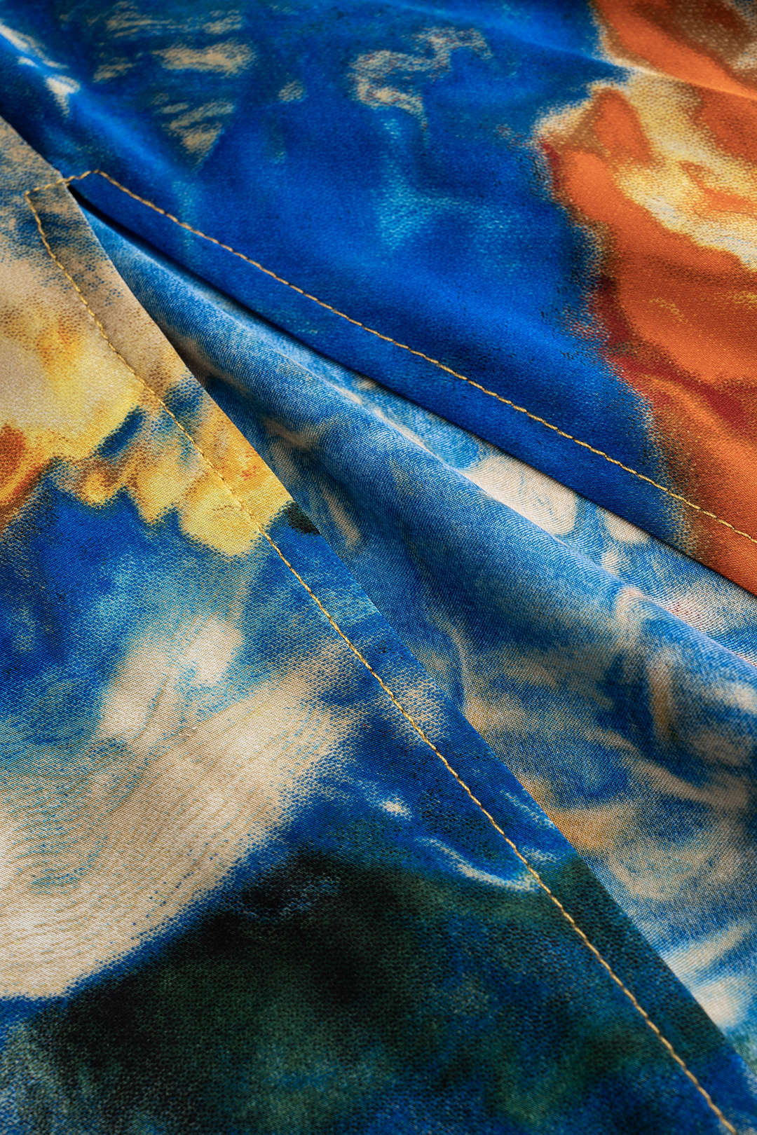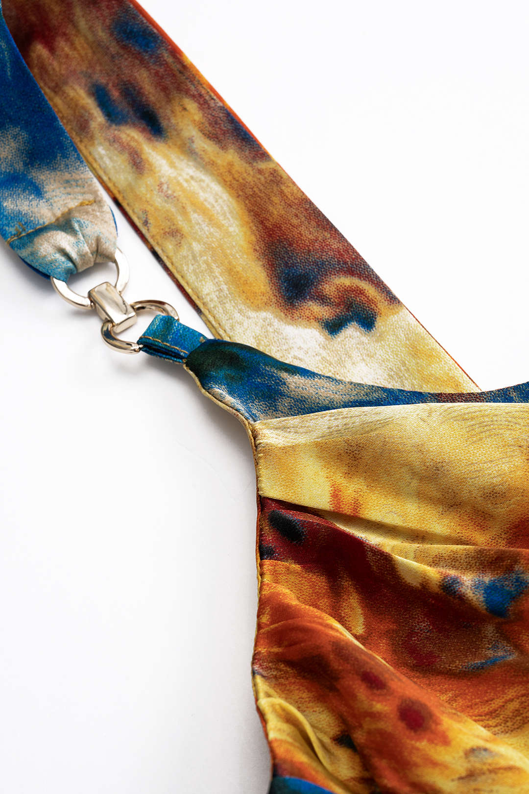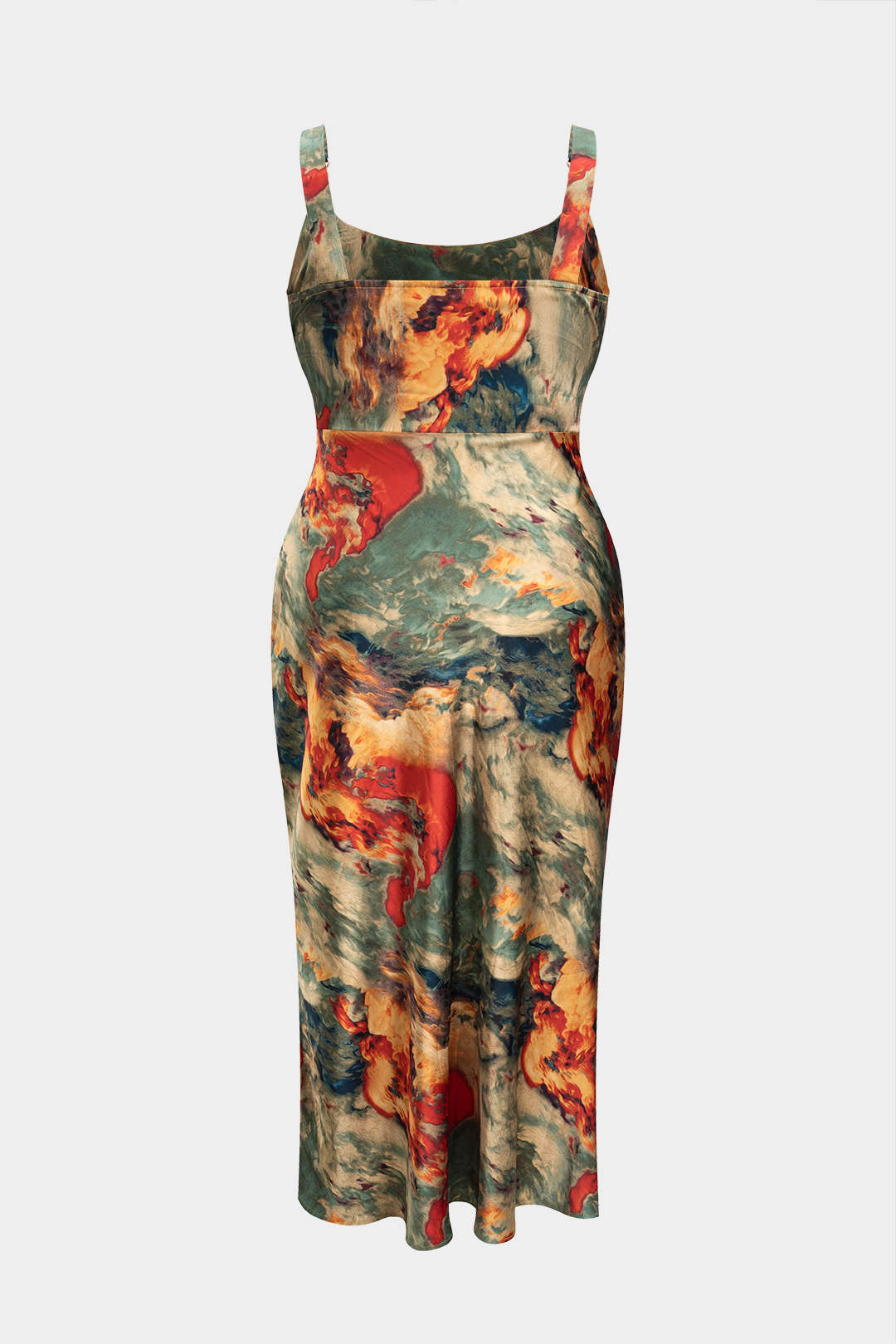 Plus Size Satin Abstract Pattern Draped Cowl Neck Slip Sleeveless Slit Midi Dress