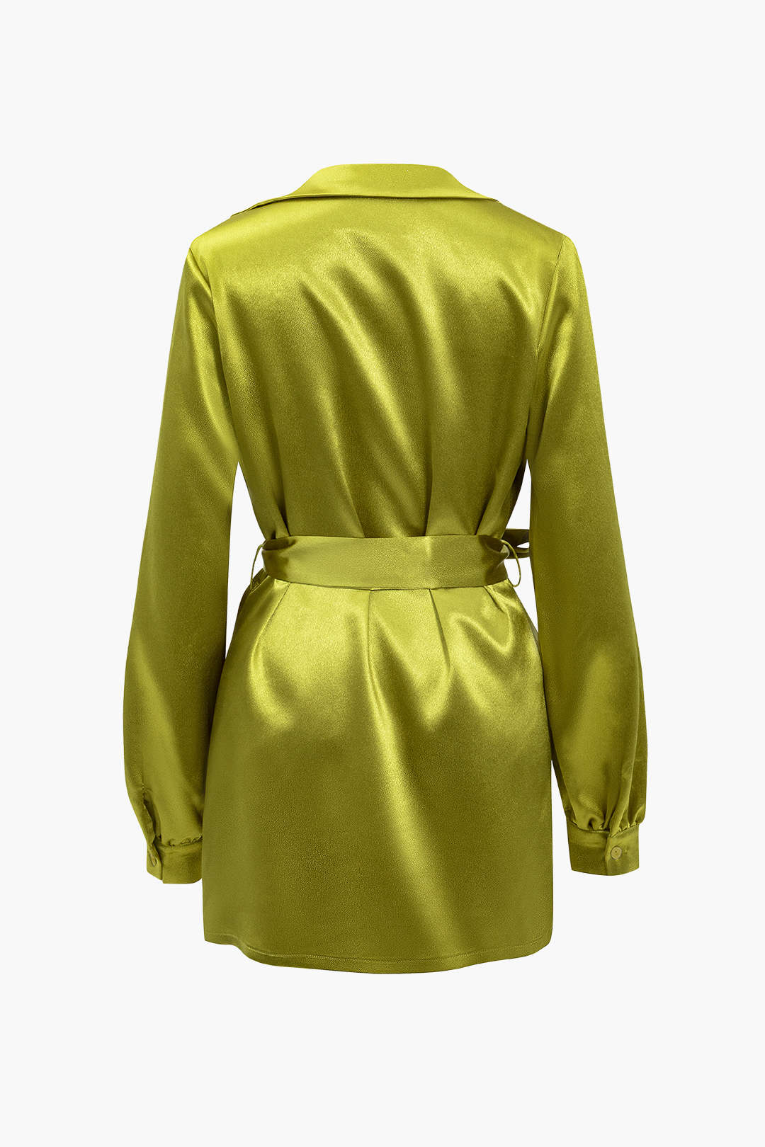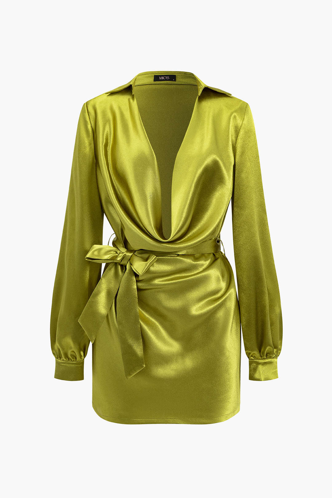 Solid Tie Front Draped Cowl Neck Belted Mini Dress