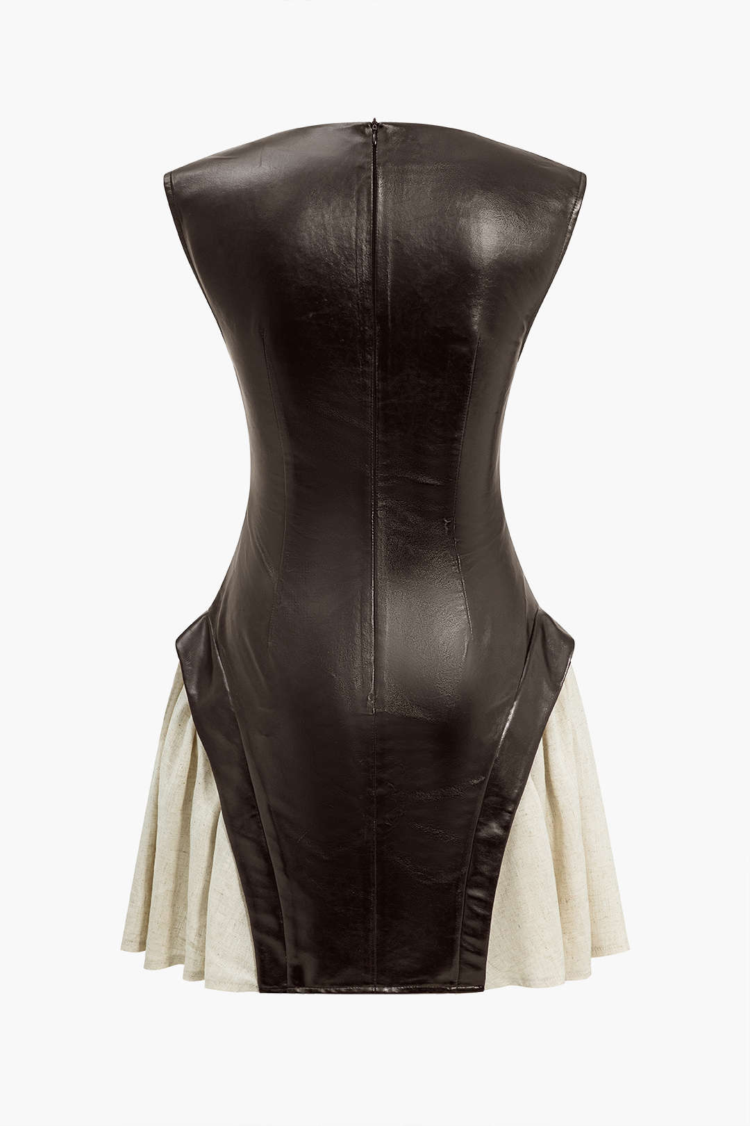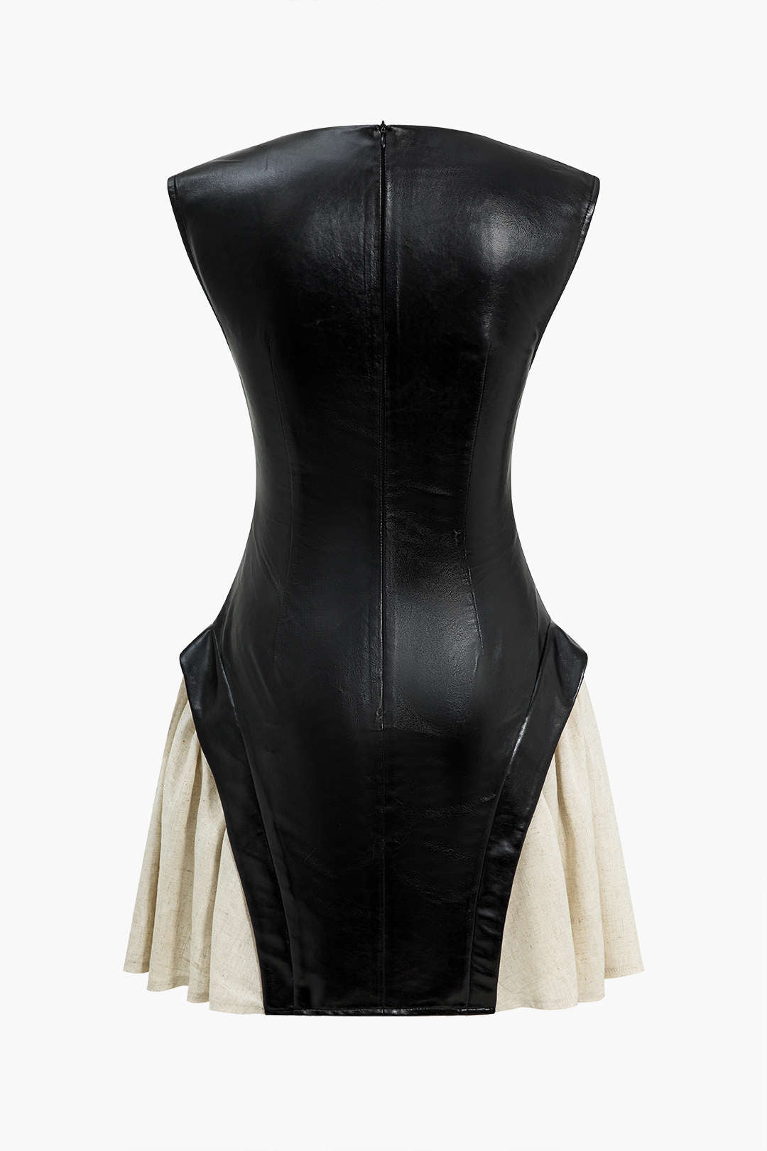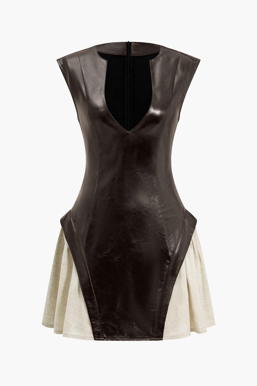 Solid Pu Patchwork Ruched Zipper Mini Dress