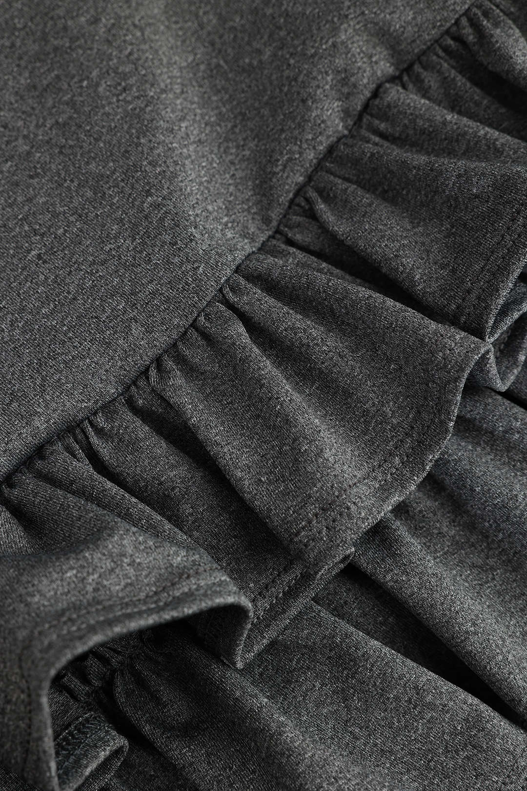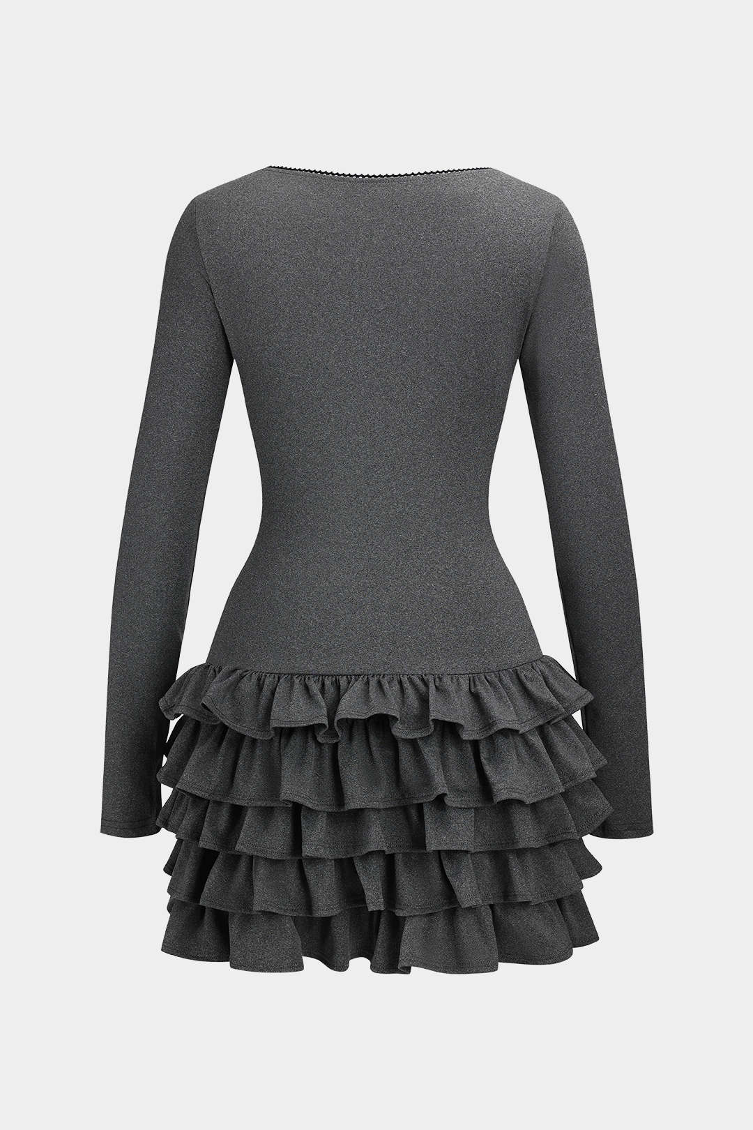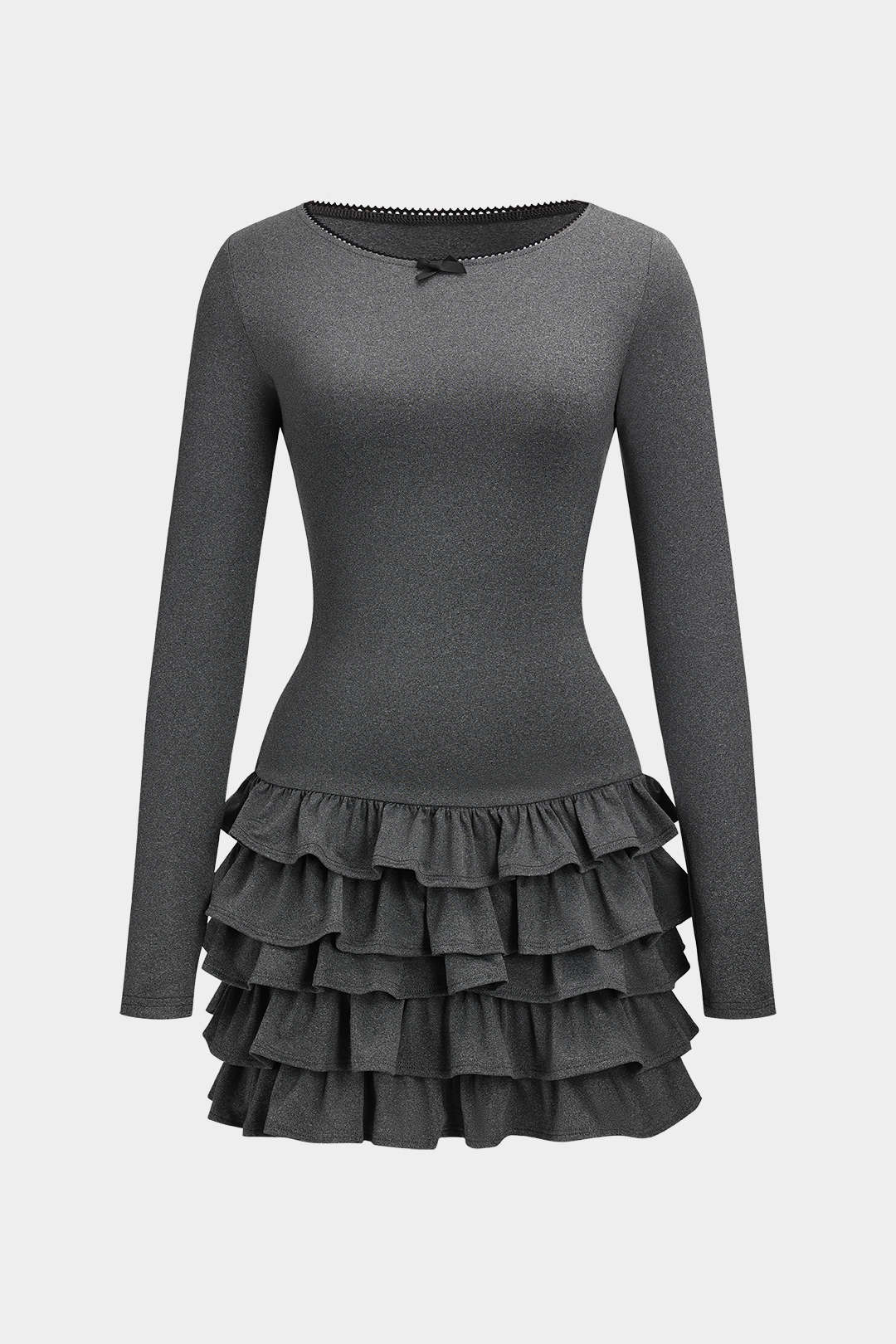 Ruffle Round Neck Puff Hem Long Sleeve Mini Dress