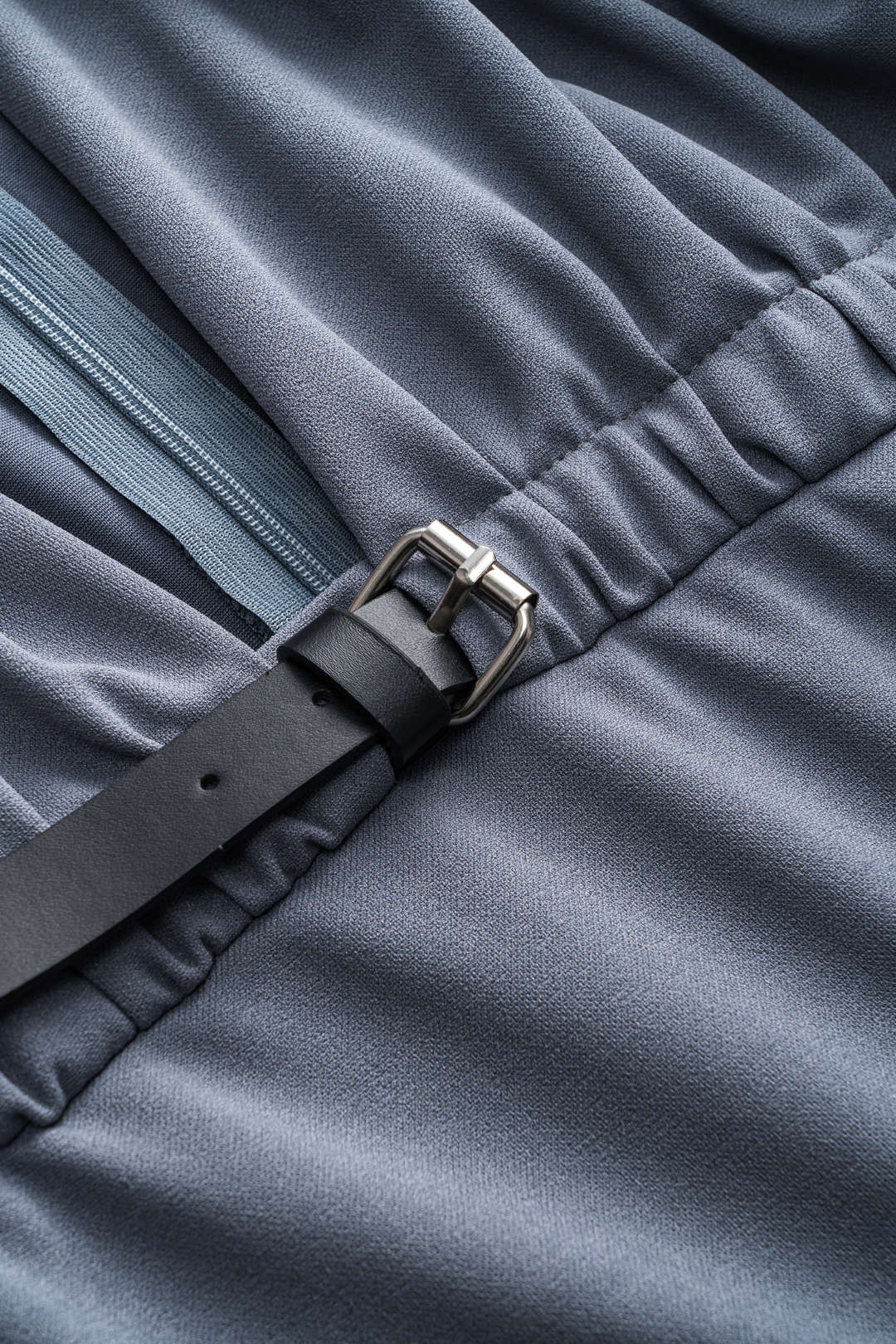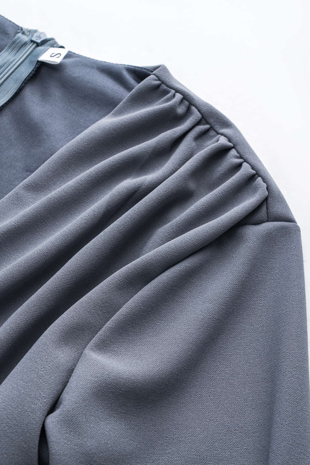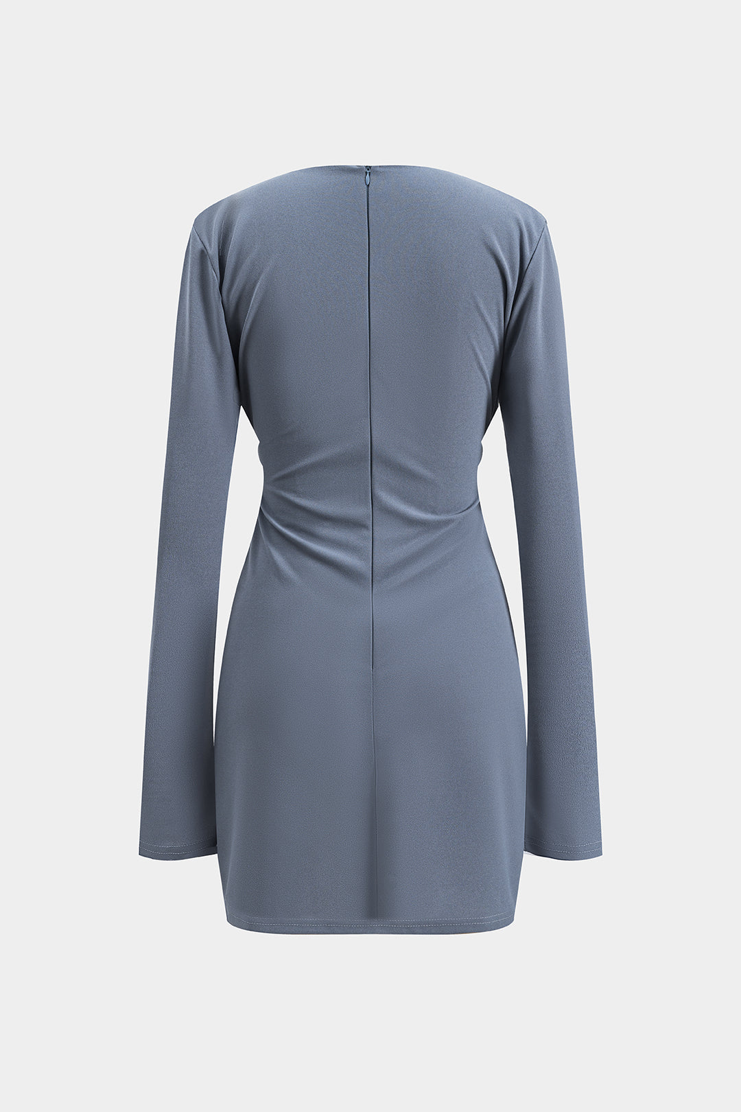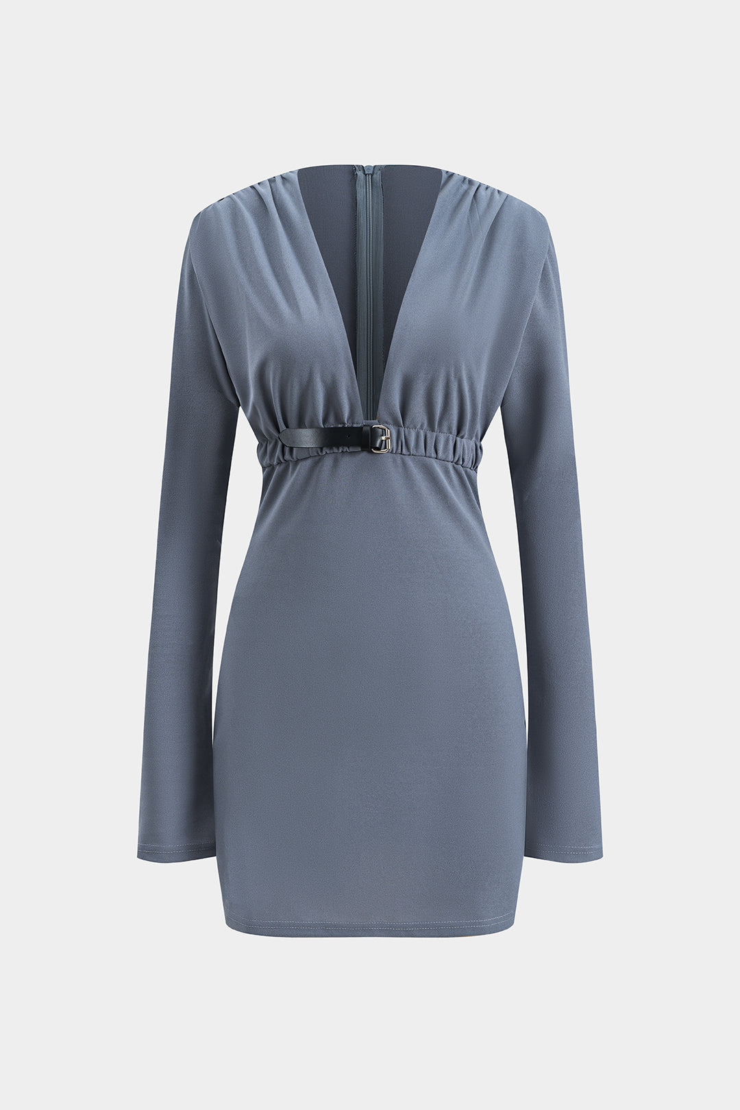 Ruched Zipper Belted V-Neck Long Sleeve Mini Dress