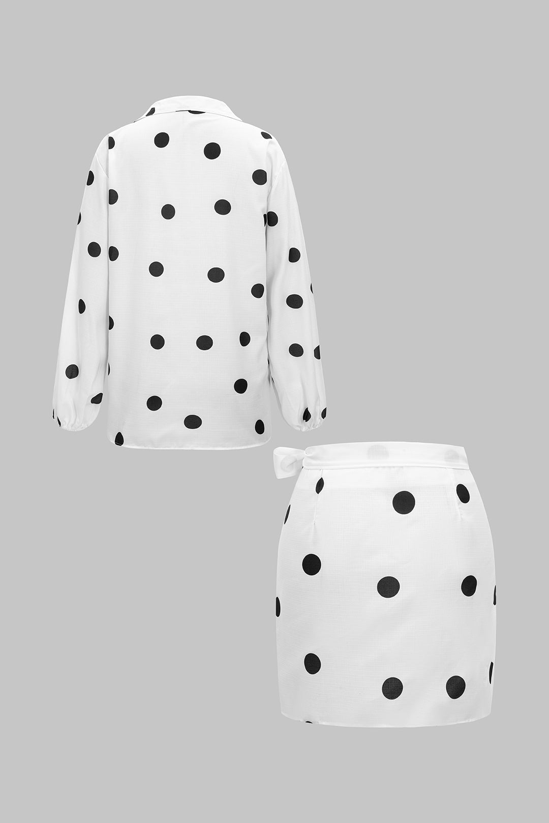 Polka Dots Print Tie-Up Detail Long Sleeve Shirt And Tie Front Mini Skirt Set