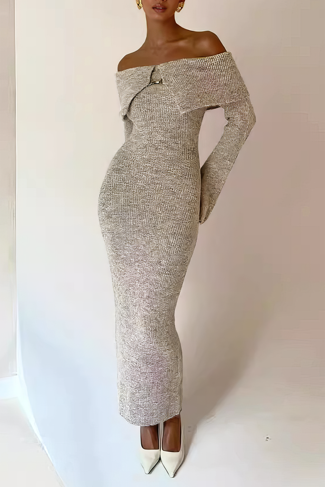 Solid Knit Bell Sleeves Off Shoulder Maxi Dress
