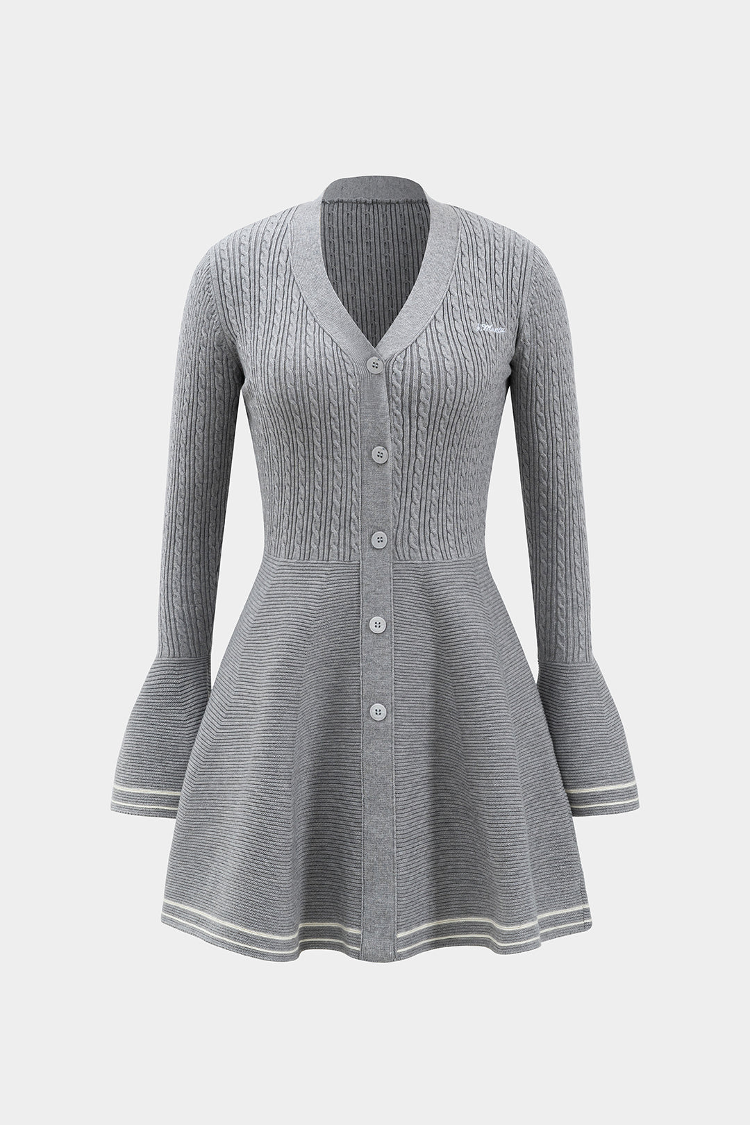 Knitted Button V-Neck Bell Sleeve Long Sleeve Sweater Dress