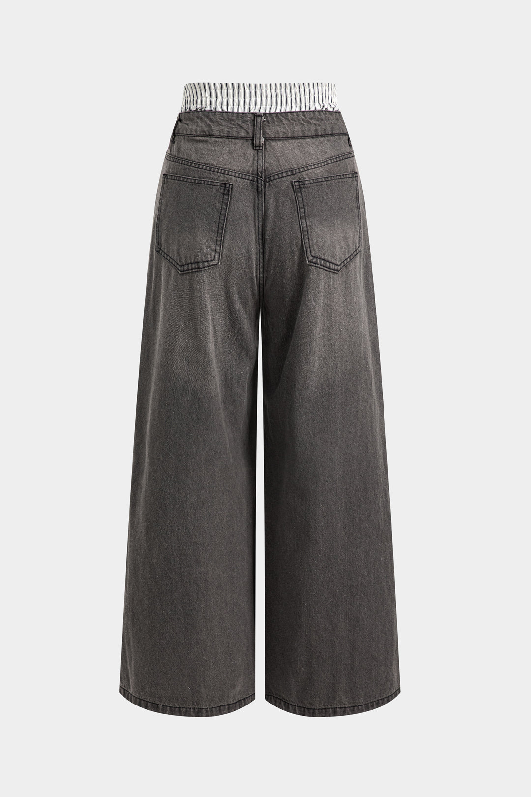 Denim Patchwork Pleated Double Waistband Button Pocket Wide Leg Jeans