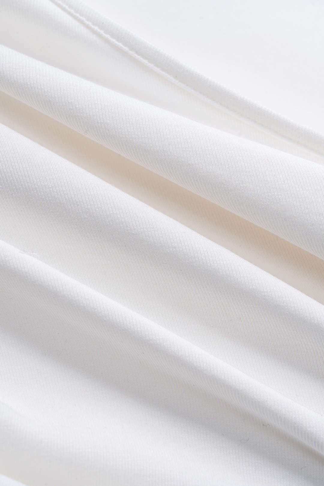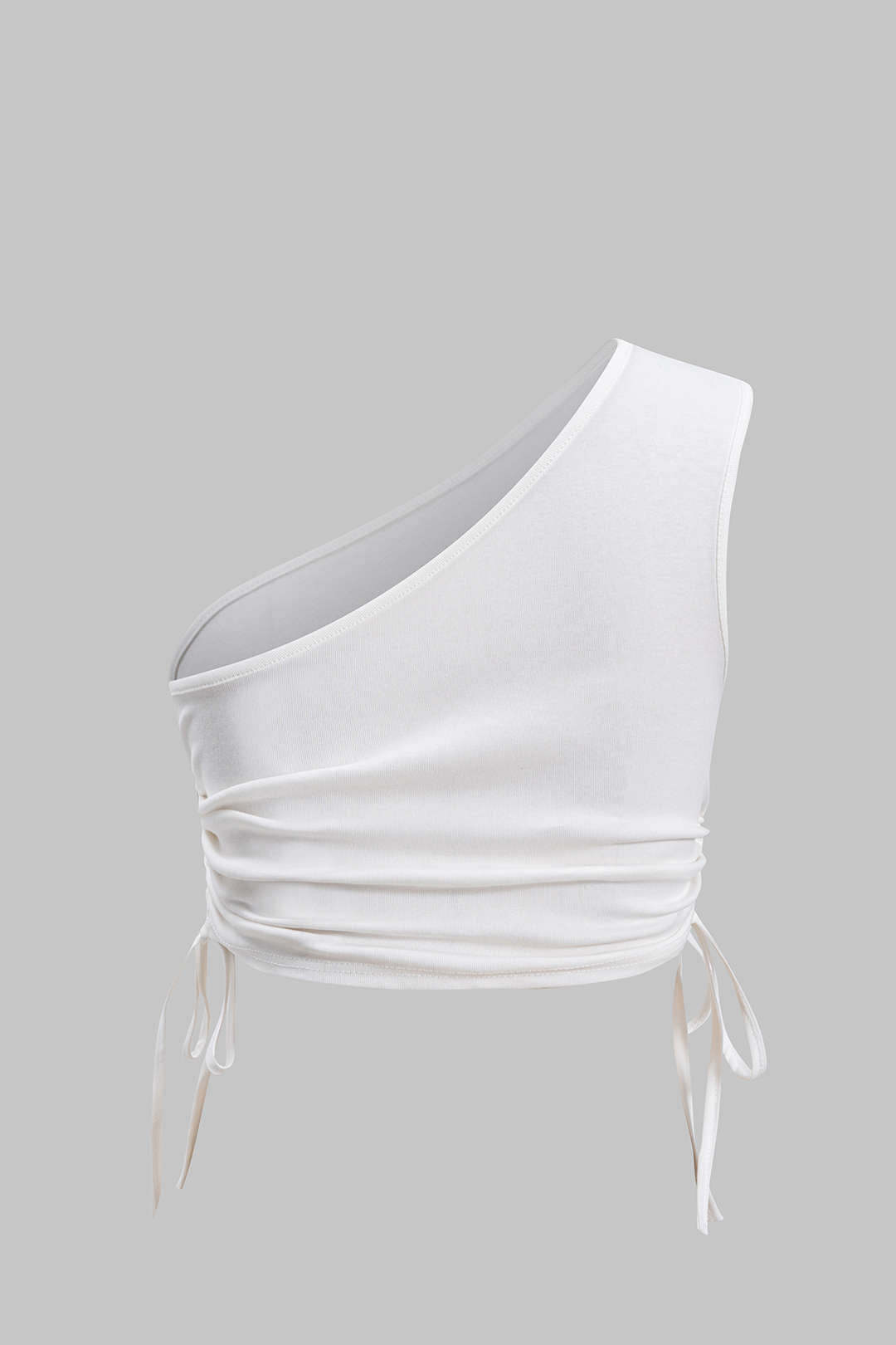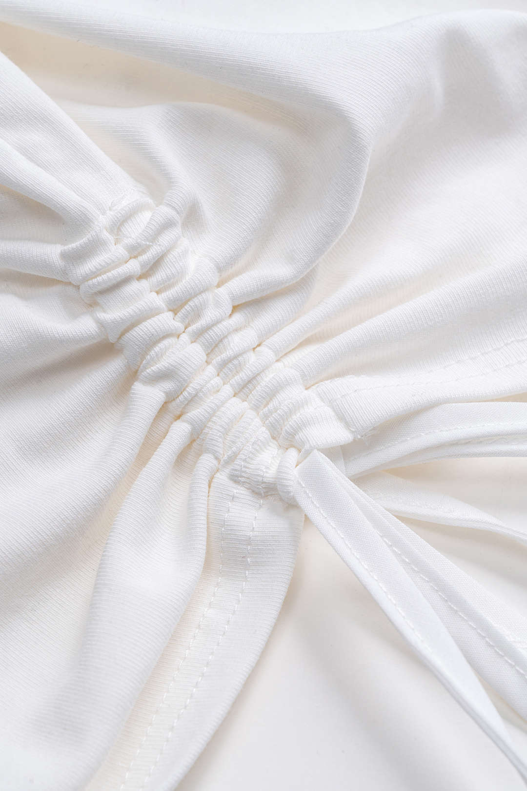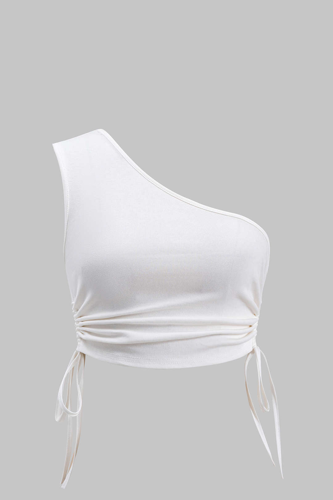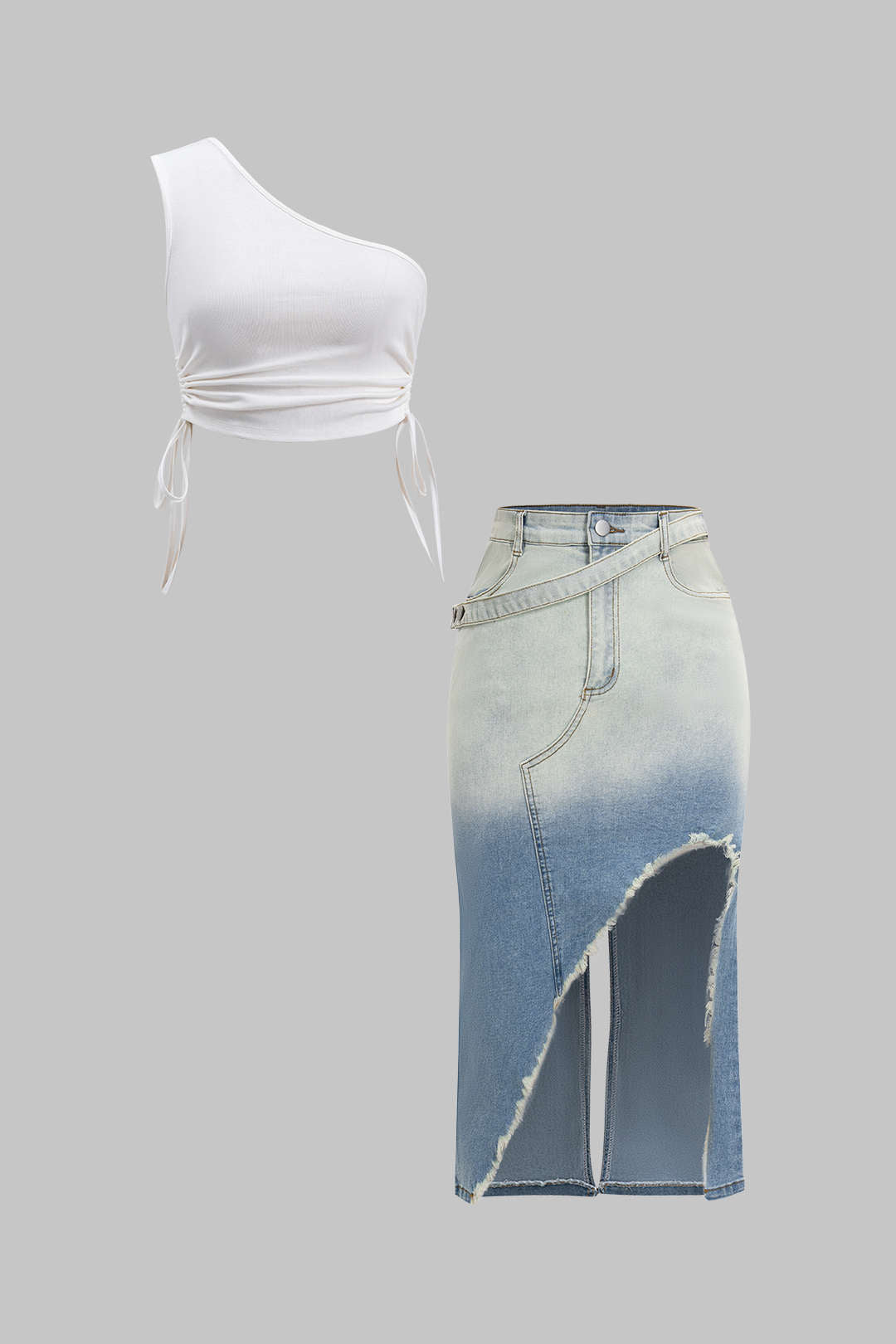 Ruched One Shoulder Asymmetrical Drawstring Top And Denim Washed Button Pocket Slit Skirt Set