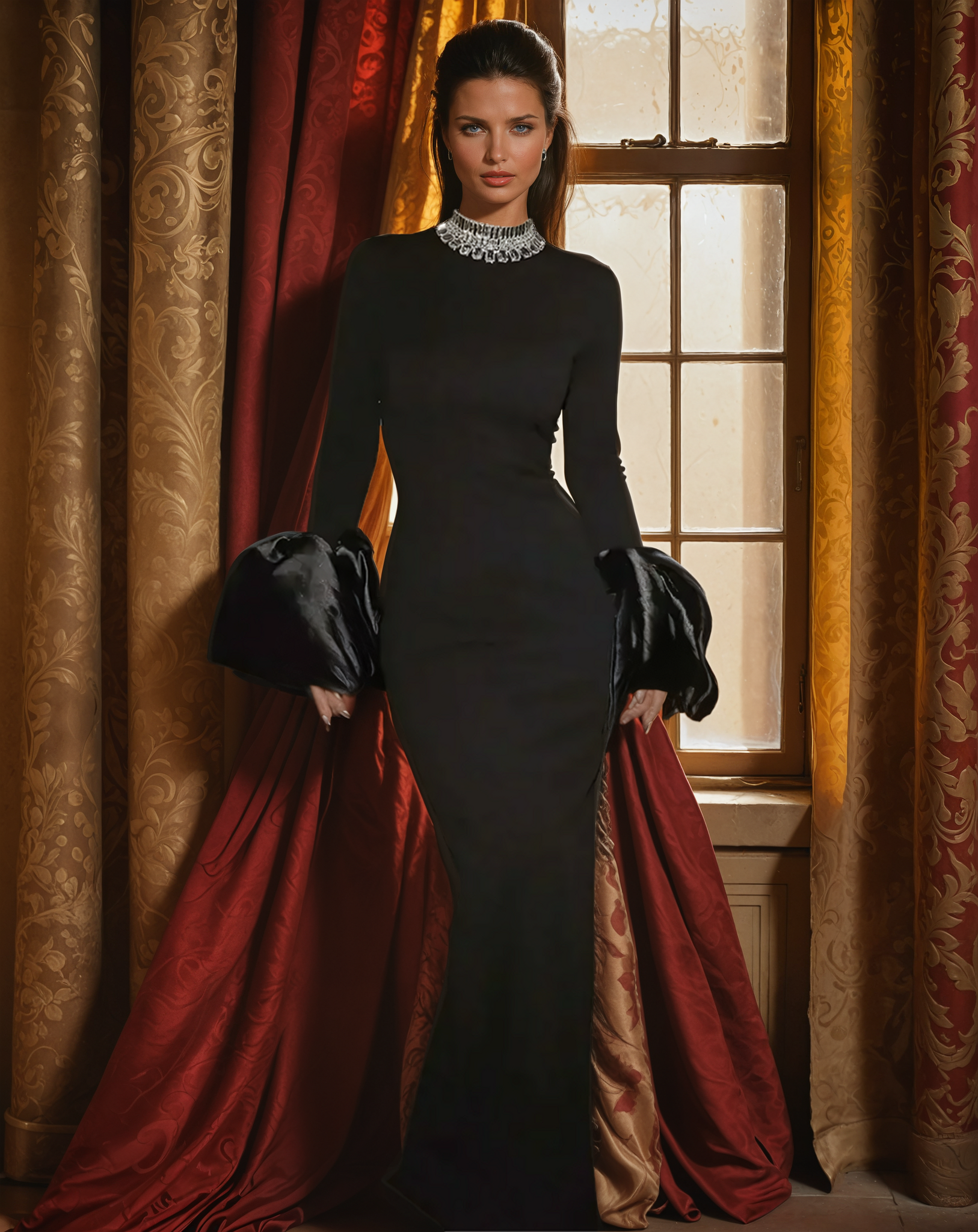 OLEVIA �NECK FLARE SLEEVE LONG BANDAGE DRESS �A STATEMENT OF TIMELESS ELEGANCE