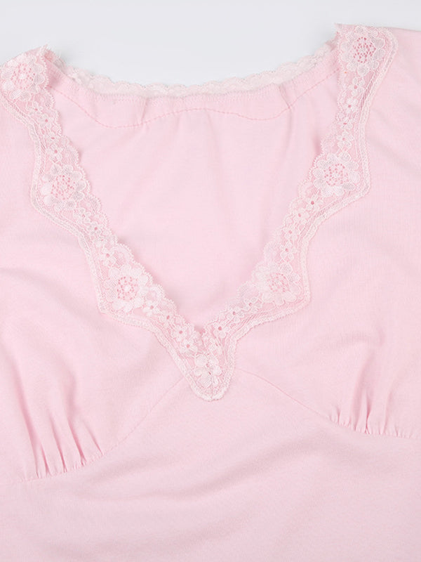 Pink Vintage V Neck Lace Trim Short Sleeve Tee