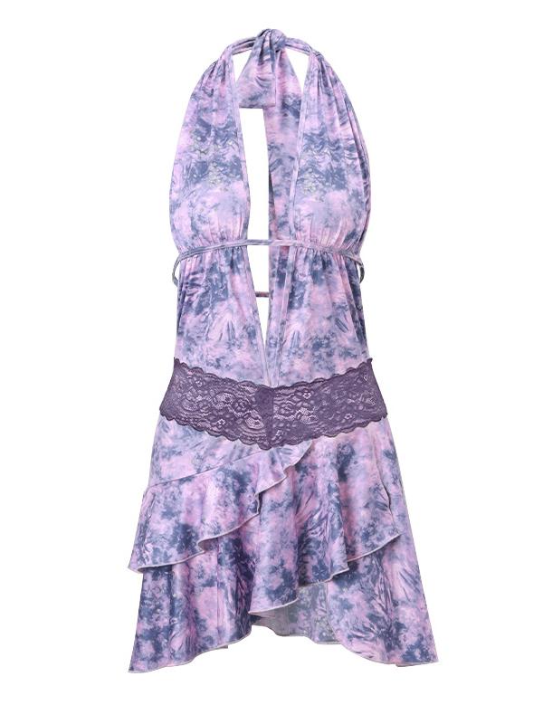 Purple Y2k Plunge Neck Mini Dress with Lace and Print