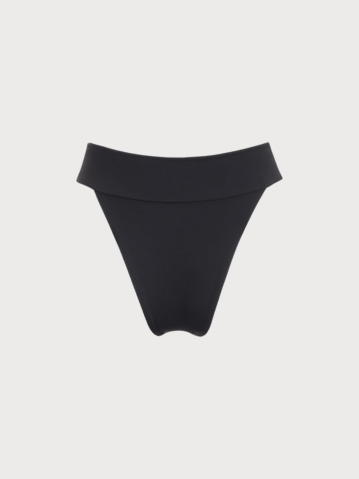 Black Ribbed High Cut Wide Waistband Bikini Bottom