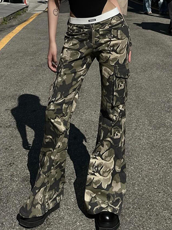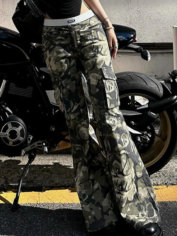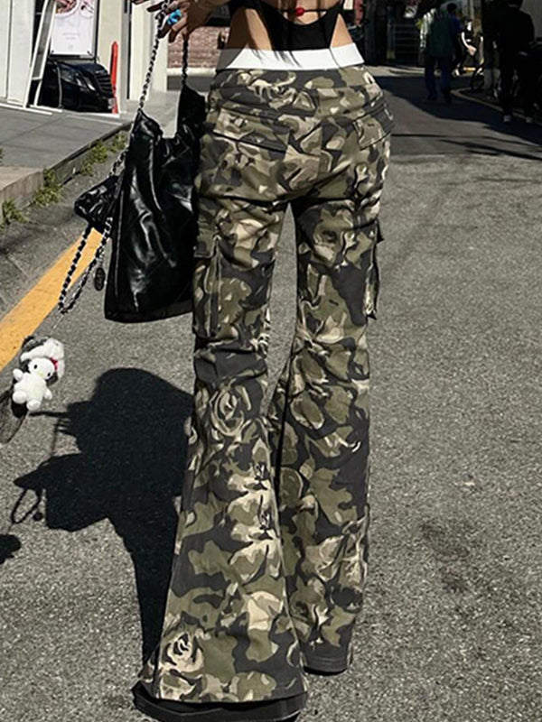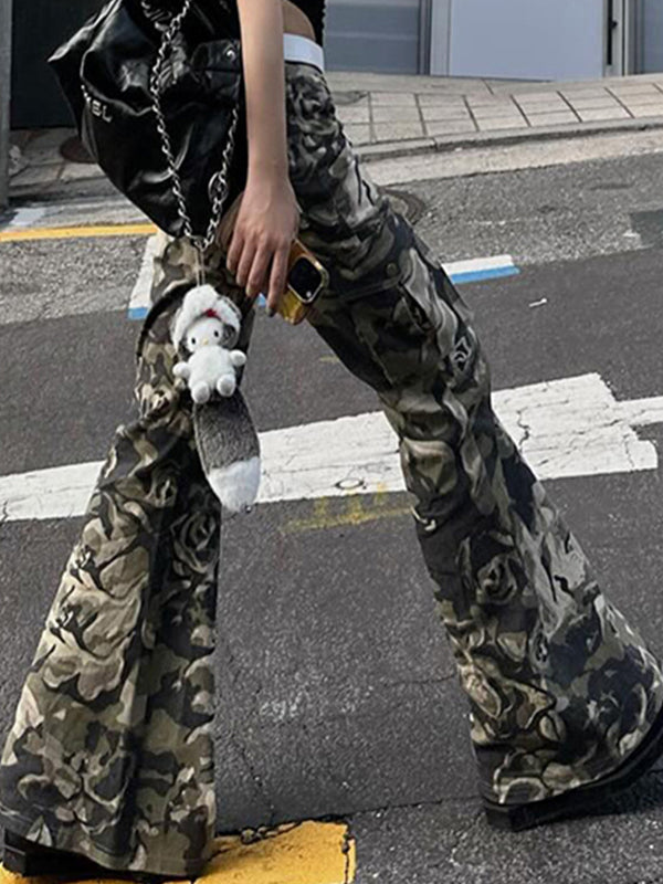 Vintage Camo Rose Print Slim Flare Leg Pants