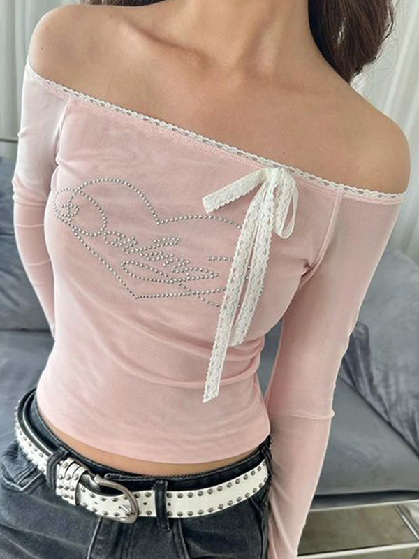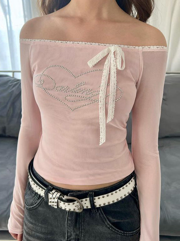 Vintage Lace Off Shoulder Heart Rhinestone Long Sleeve Tee